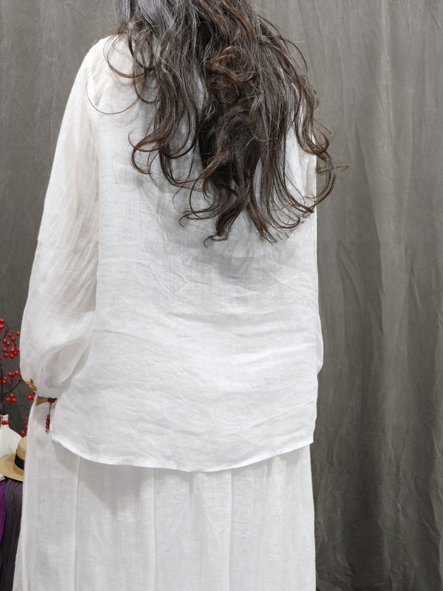 Camicia da donna con scollo a V e ricamo floreale artistico in 100% ramia