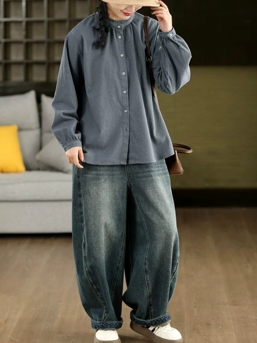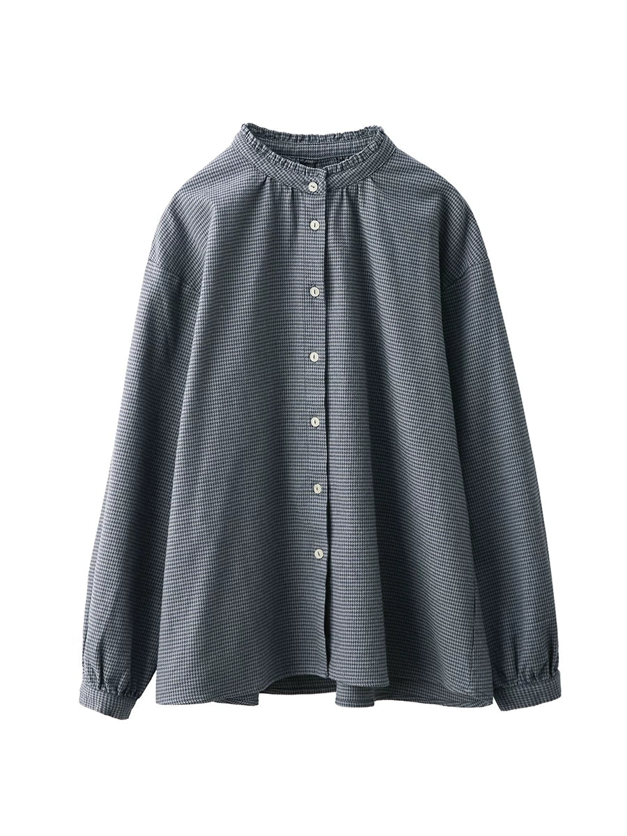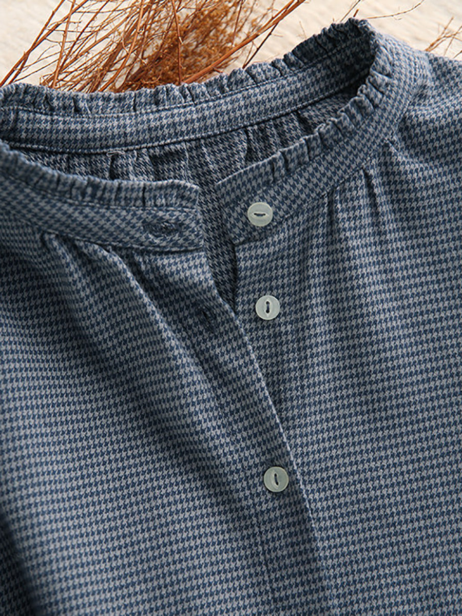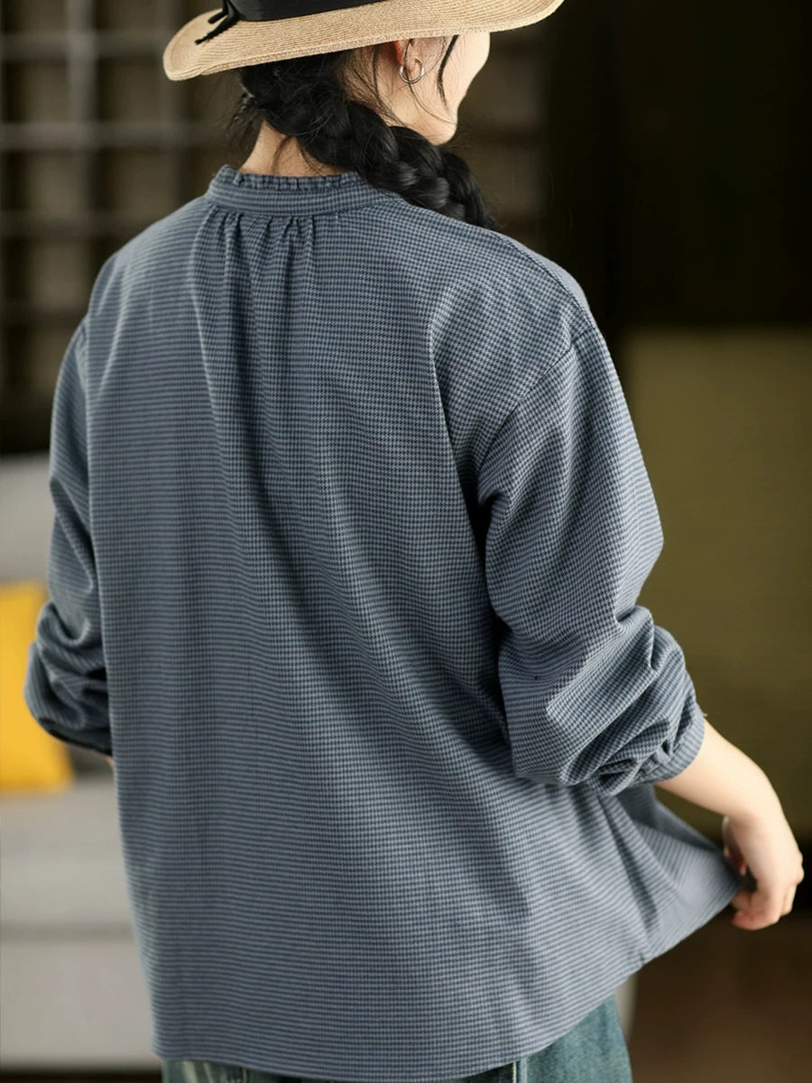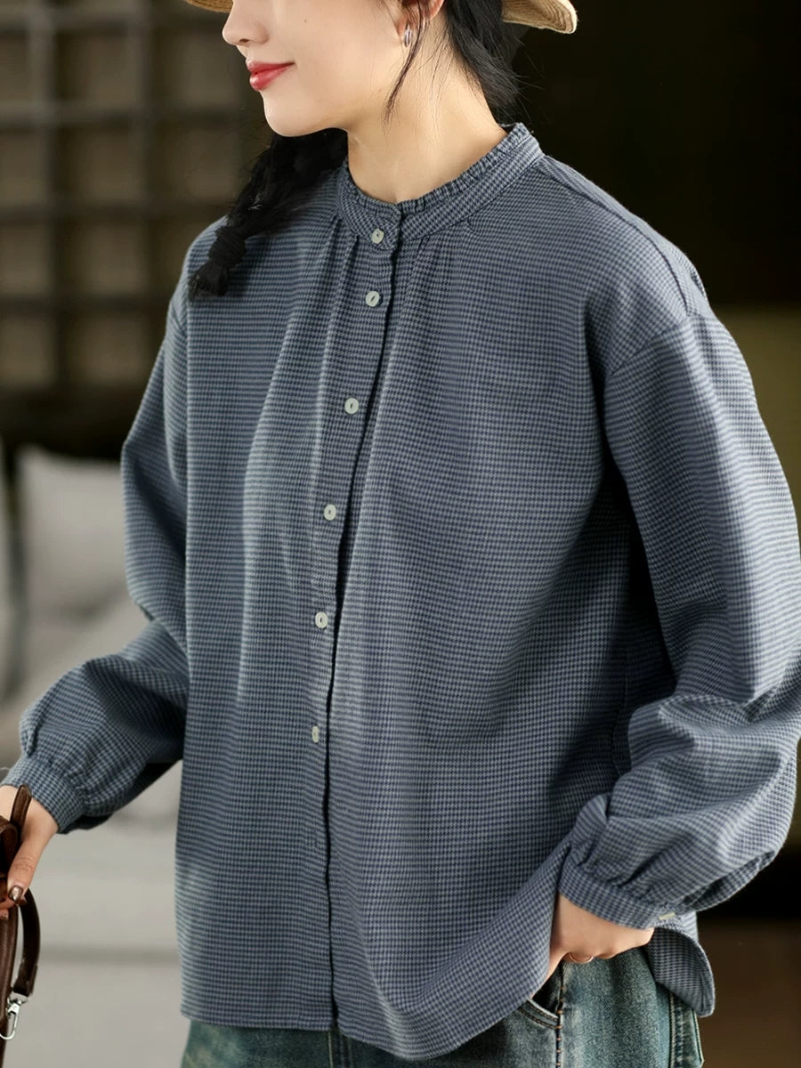 Camicia da donna primavera con colletto alto e motivo a traliccio artistico in 100% cotone