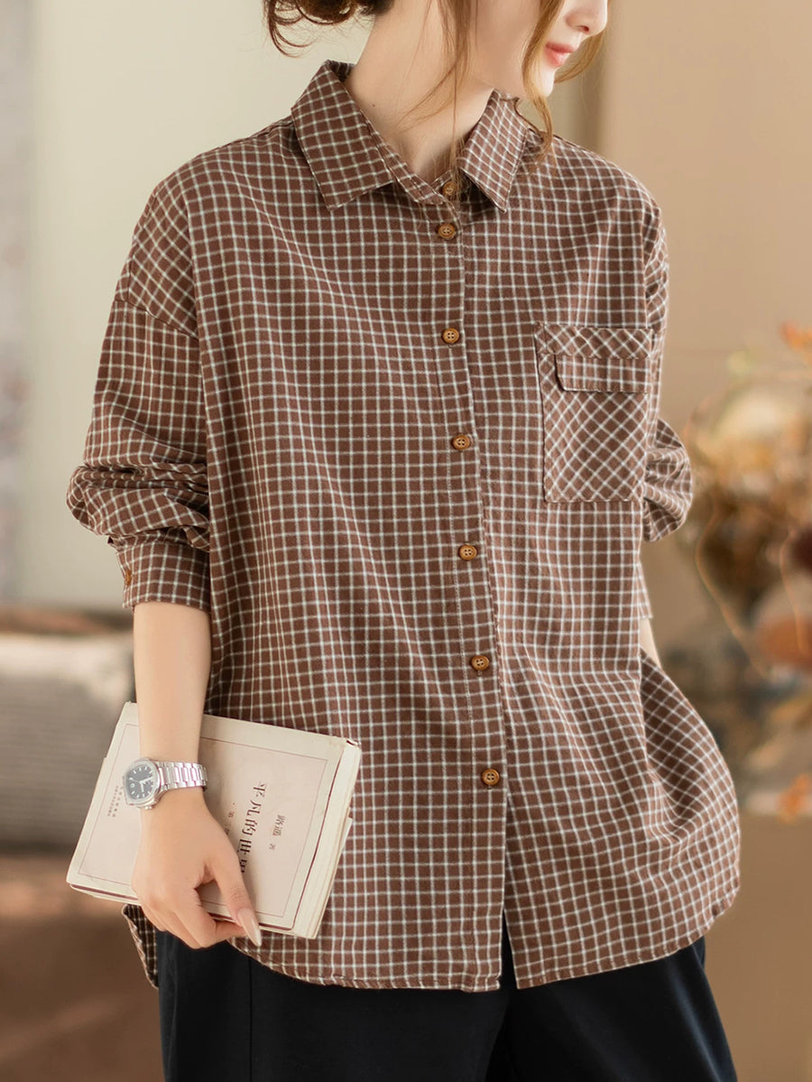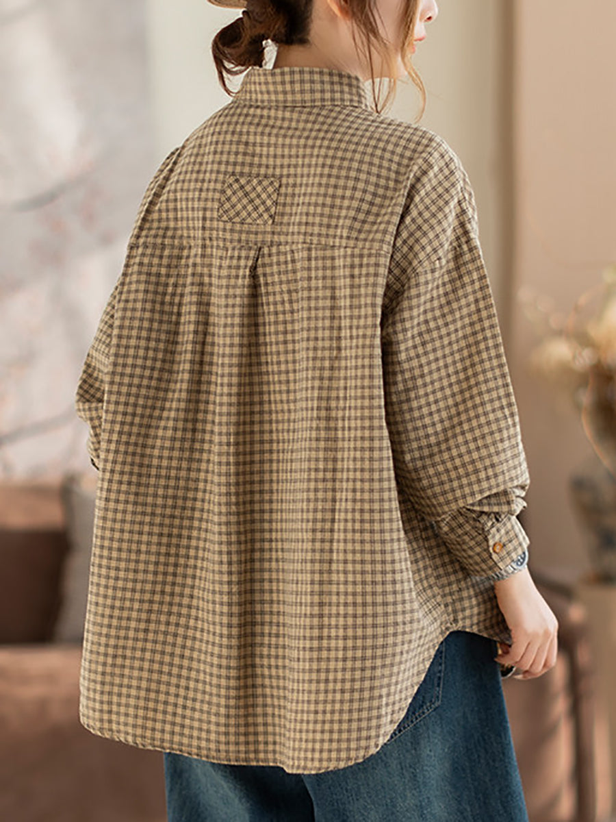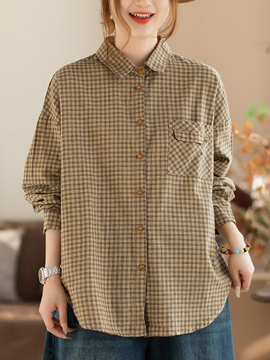 Camicia da donna con colletto rovesciato e motivo a traliccio artistico primaverile