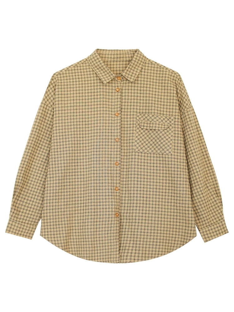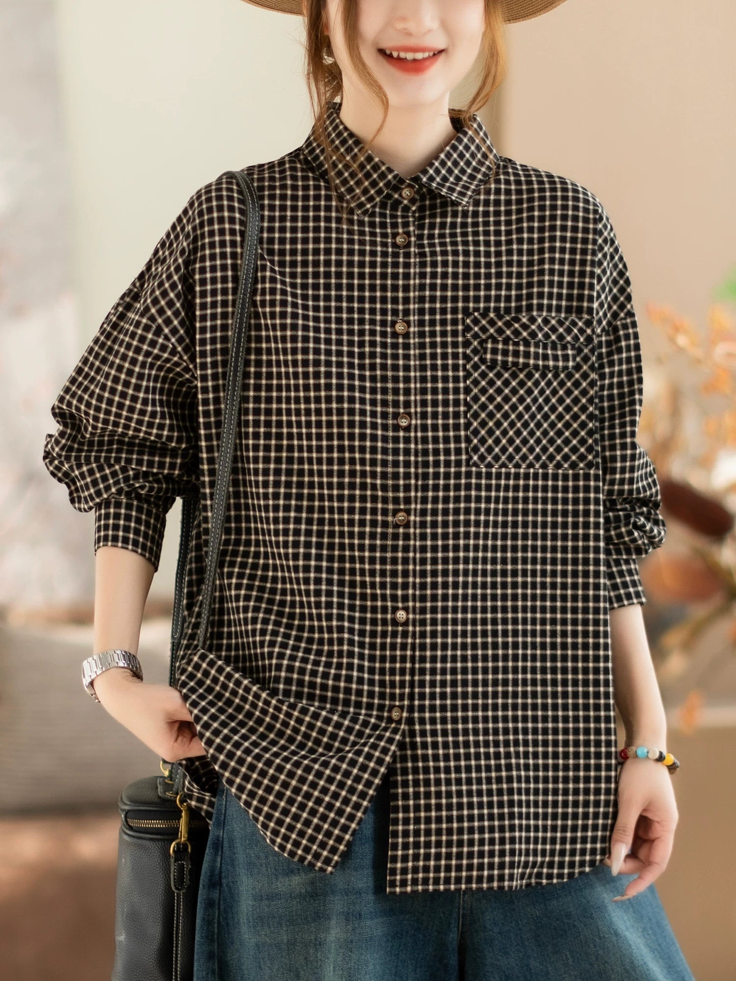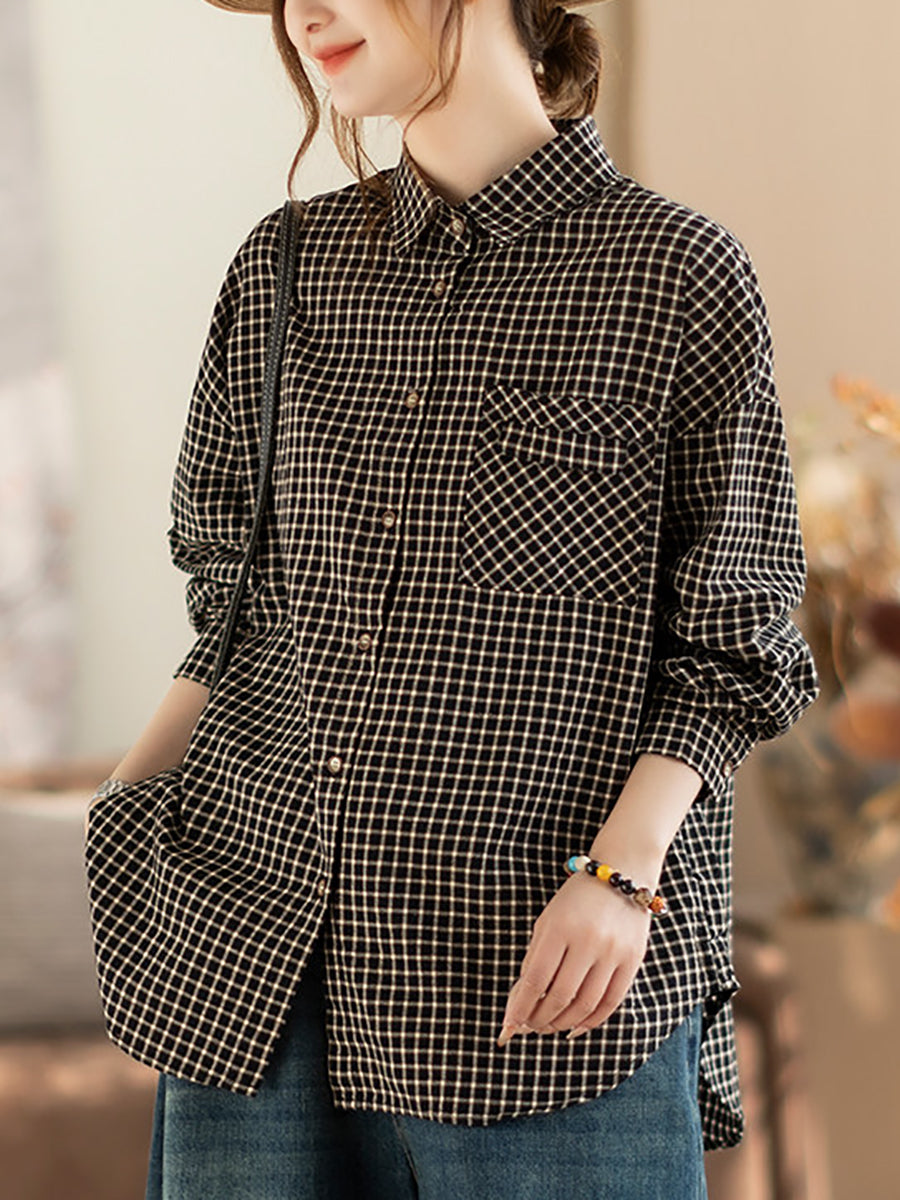 Camicia da donna con colletto rovesciato e motivo a traliccio artistico primaverile