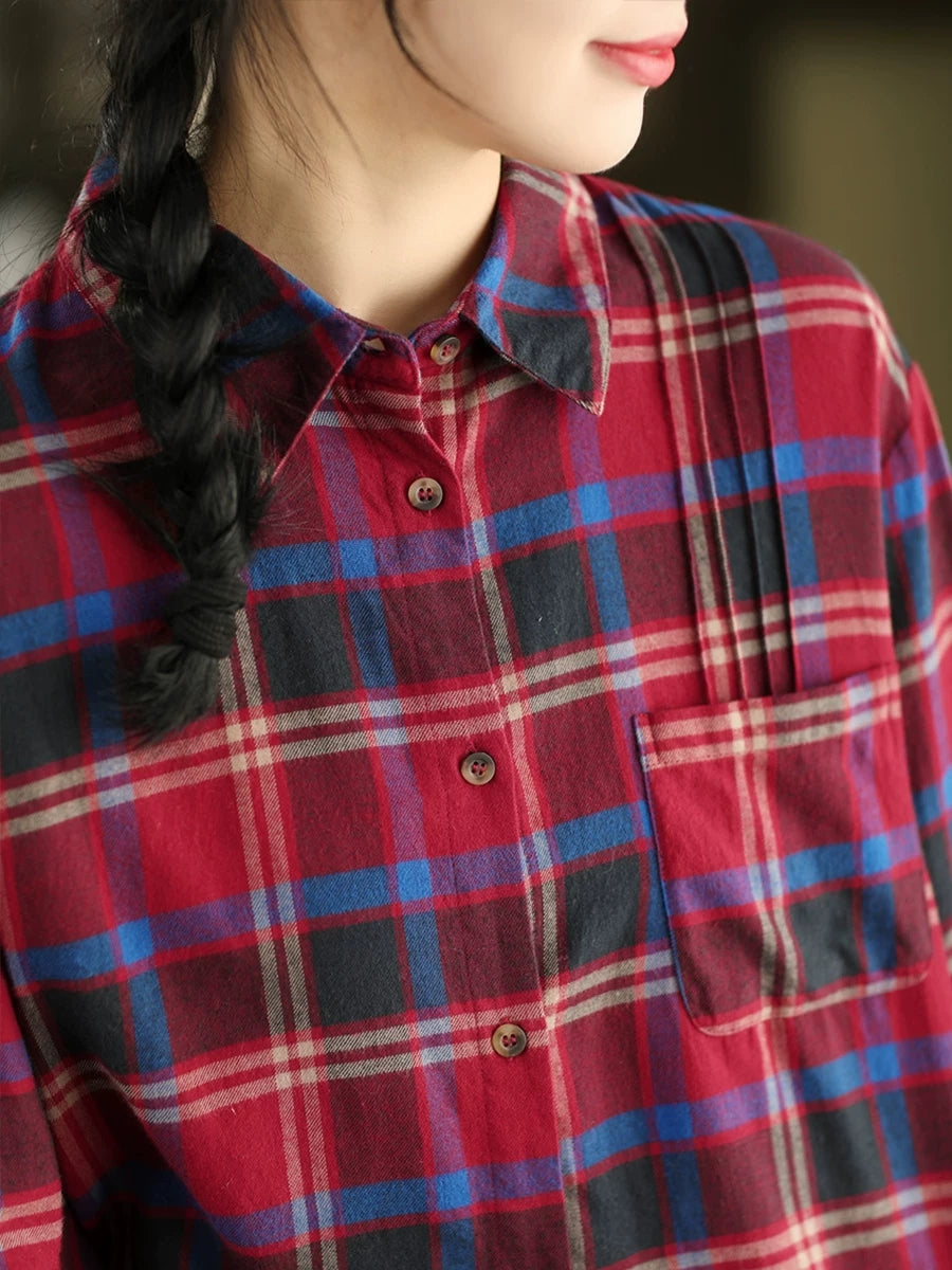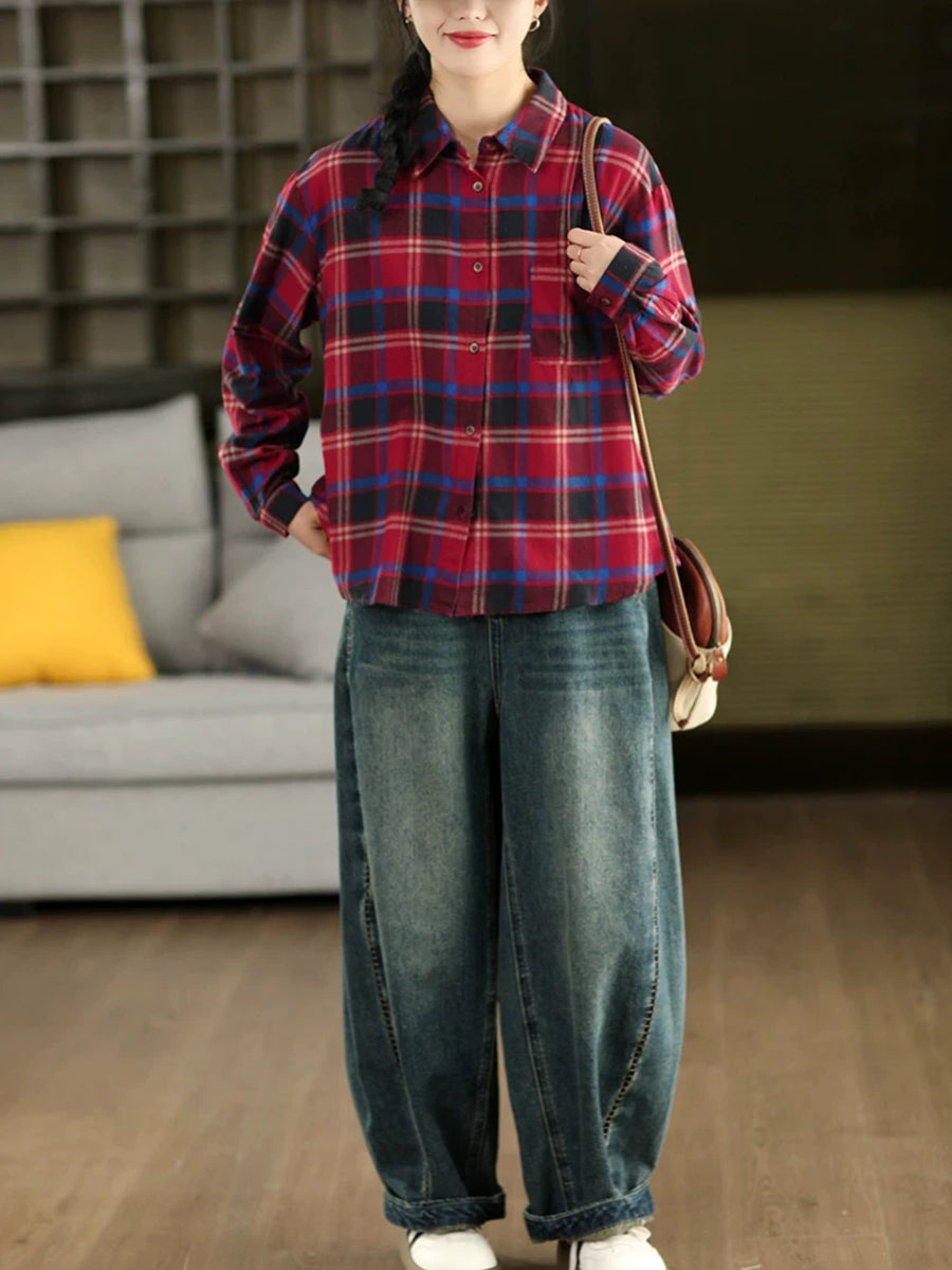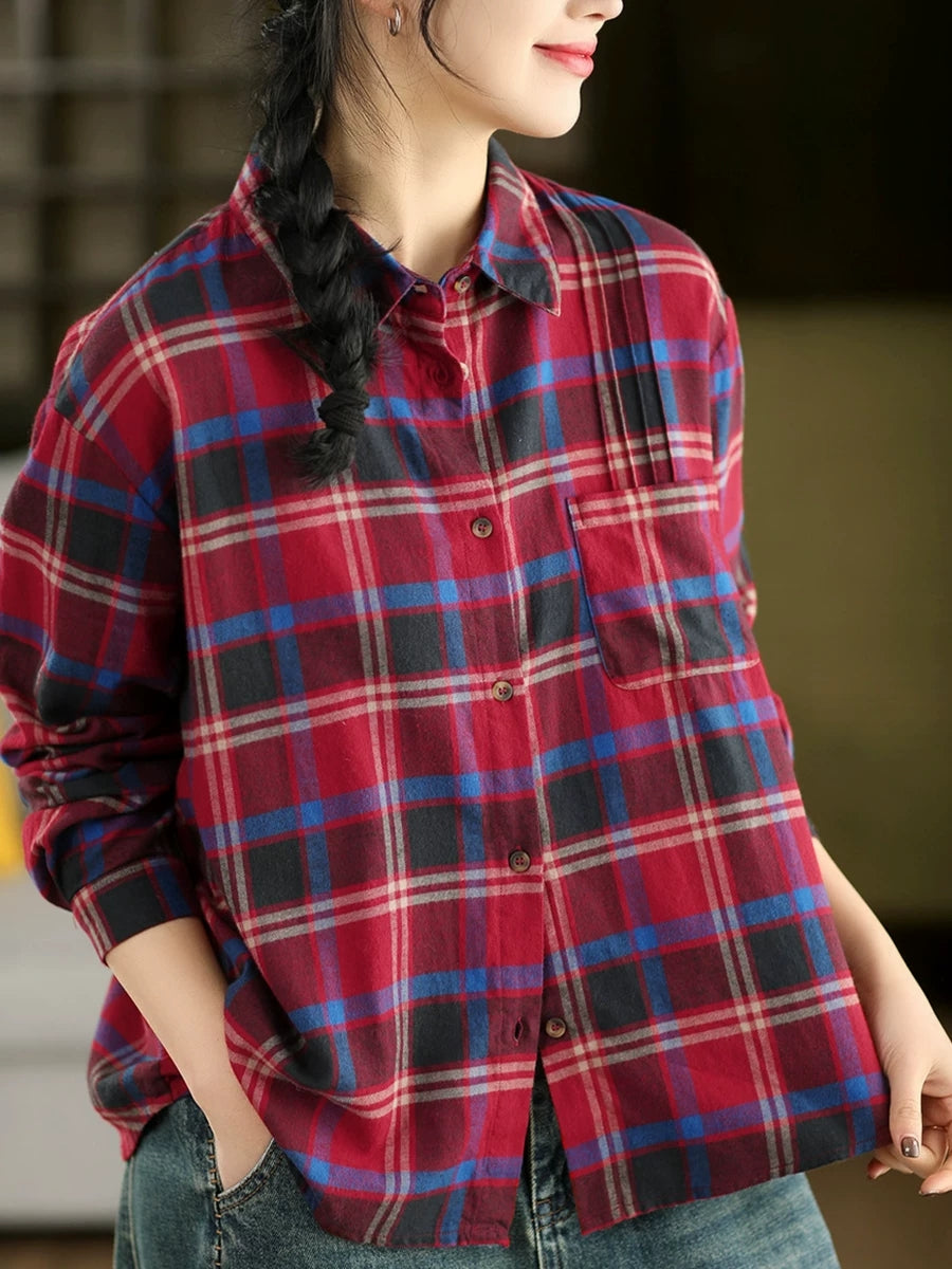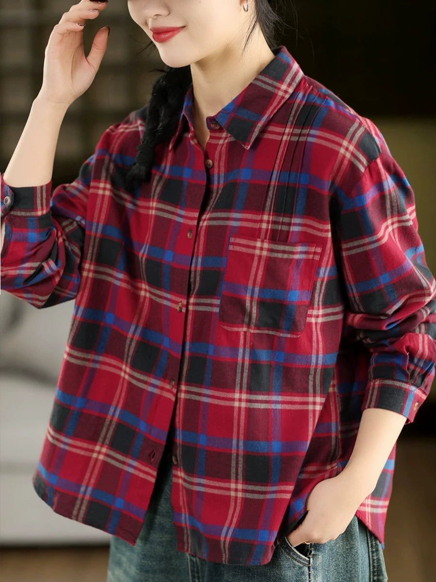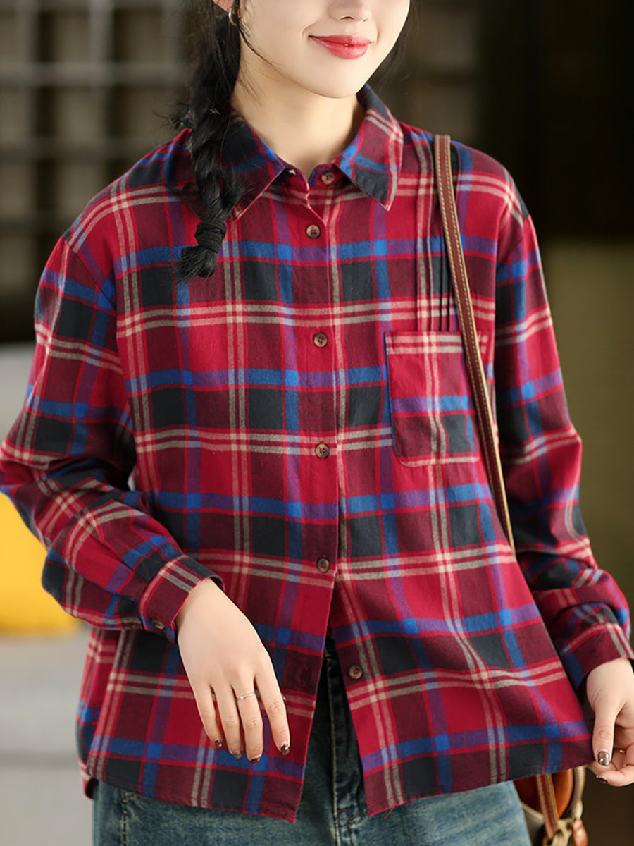 Camicia da donna con colletto rovesciato e motivo scozzese artistico primaverile