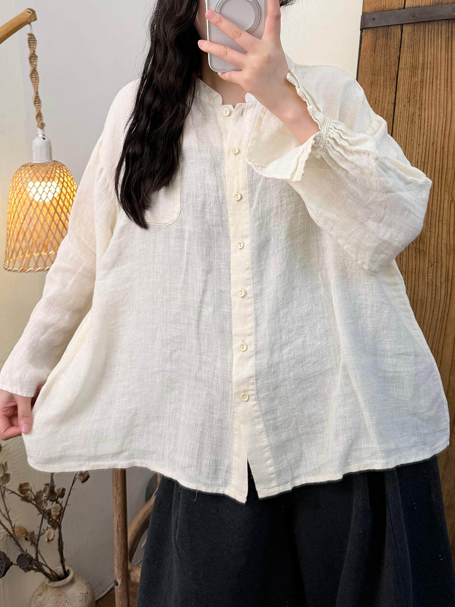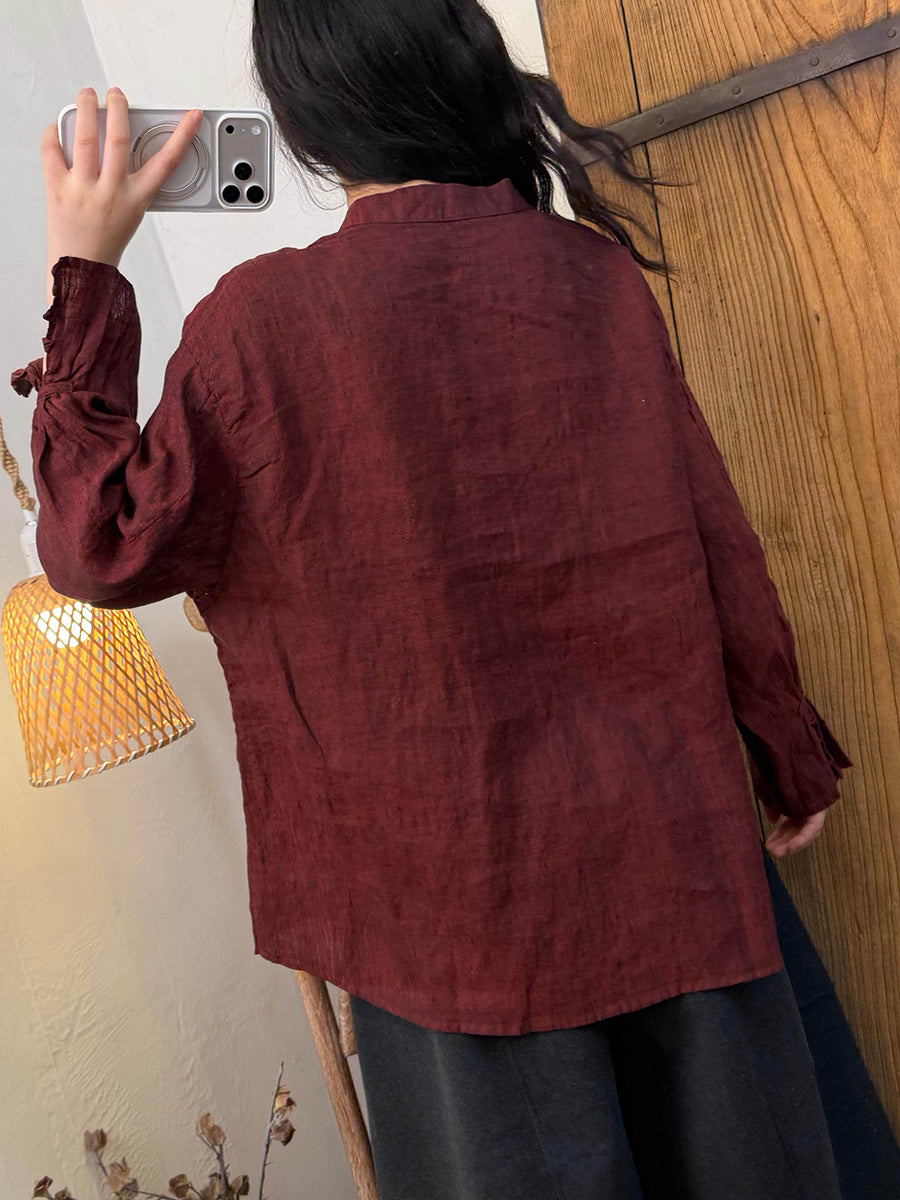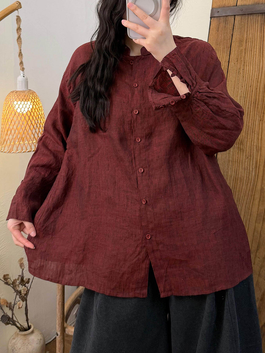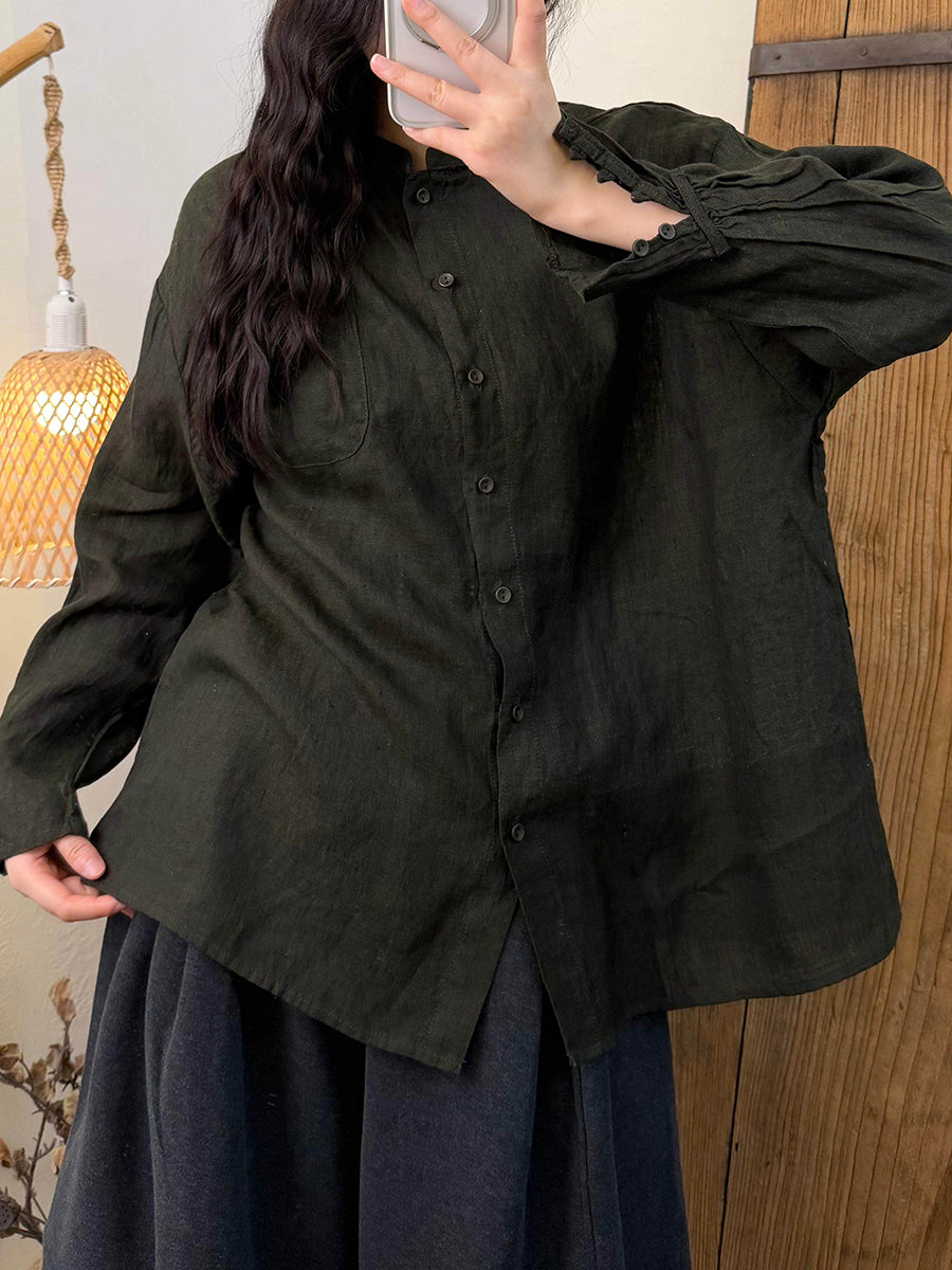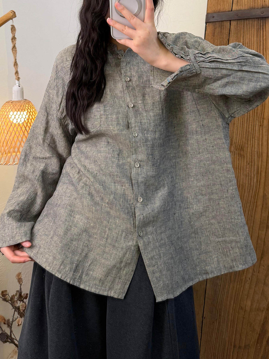 Camicia da donna primaverile in lino con collo alto, colore puro e artistico