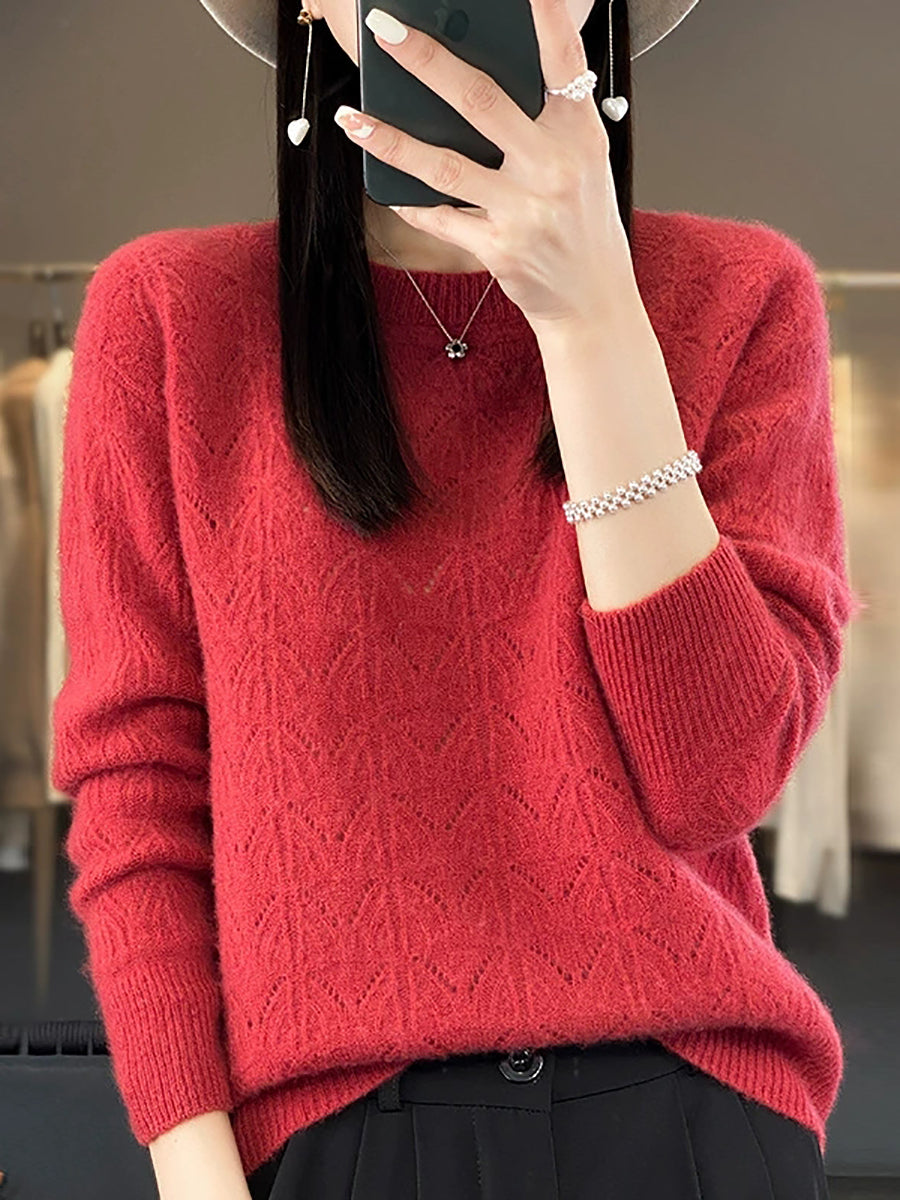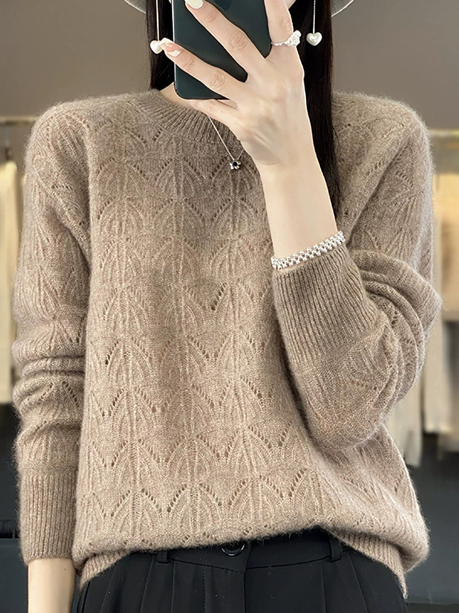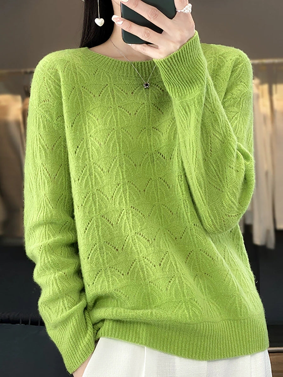 Maglione da donna in lana con scollo rotondo, colore puro e artistico, primaverile