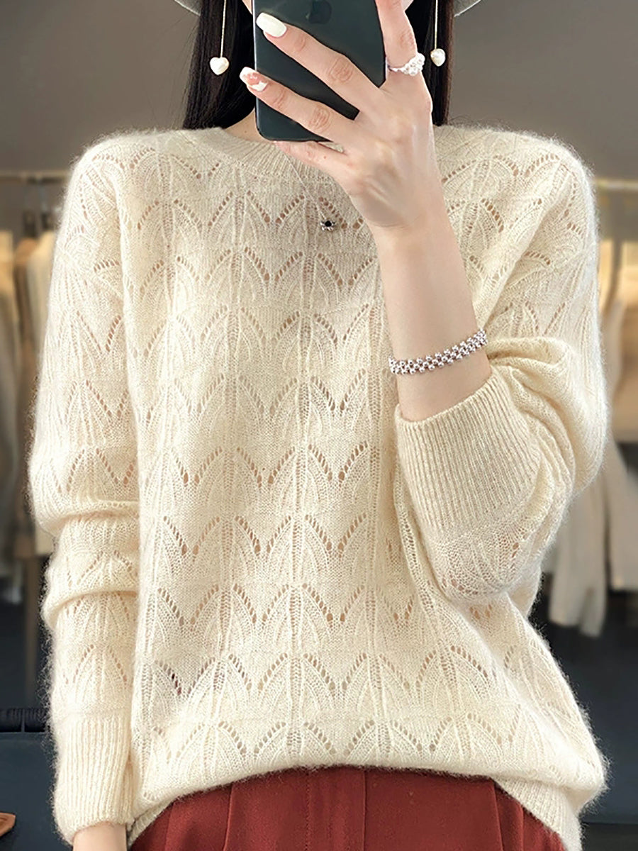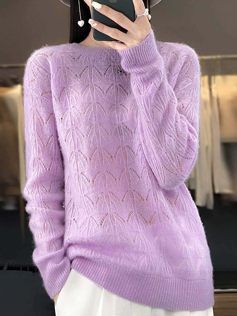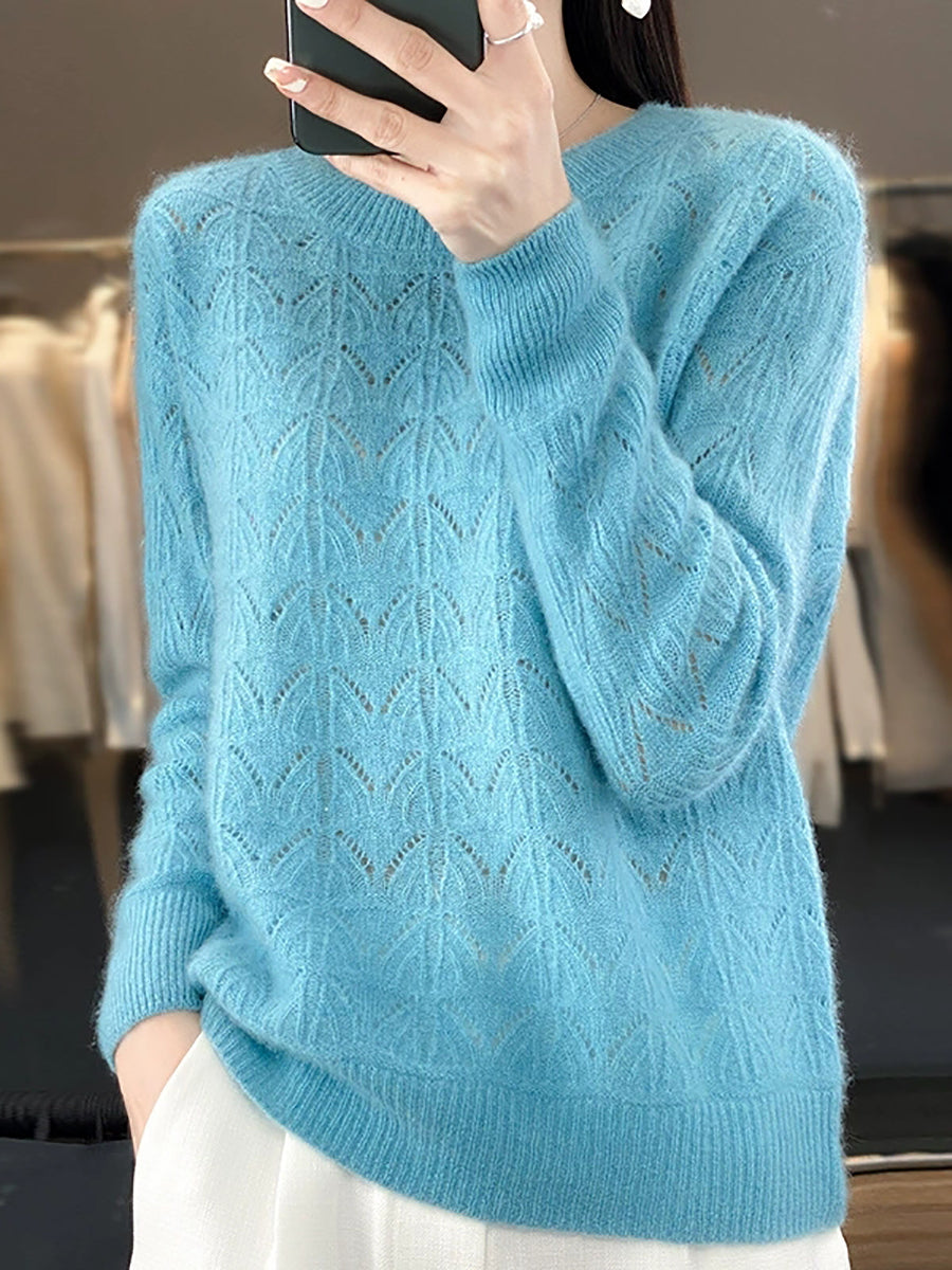 Maglione da donna in lana con scollo rotondo, colore puro e artistico, primaverile