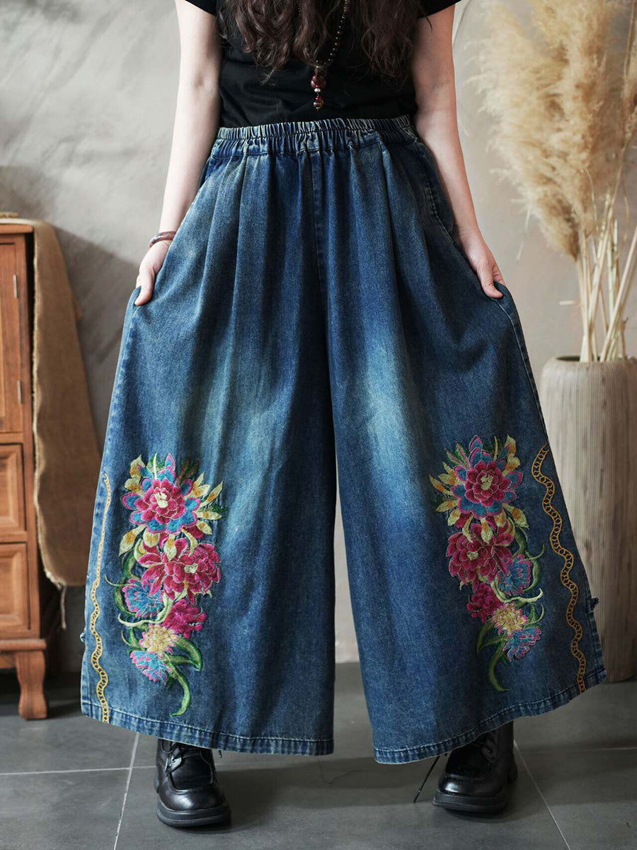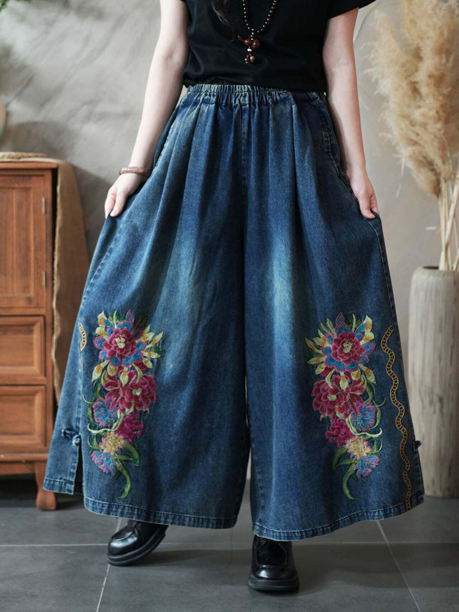 Pantaloni larghi in denim con ricamo floreale primaverile da donna