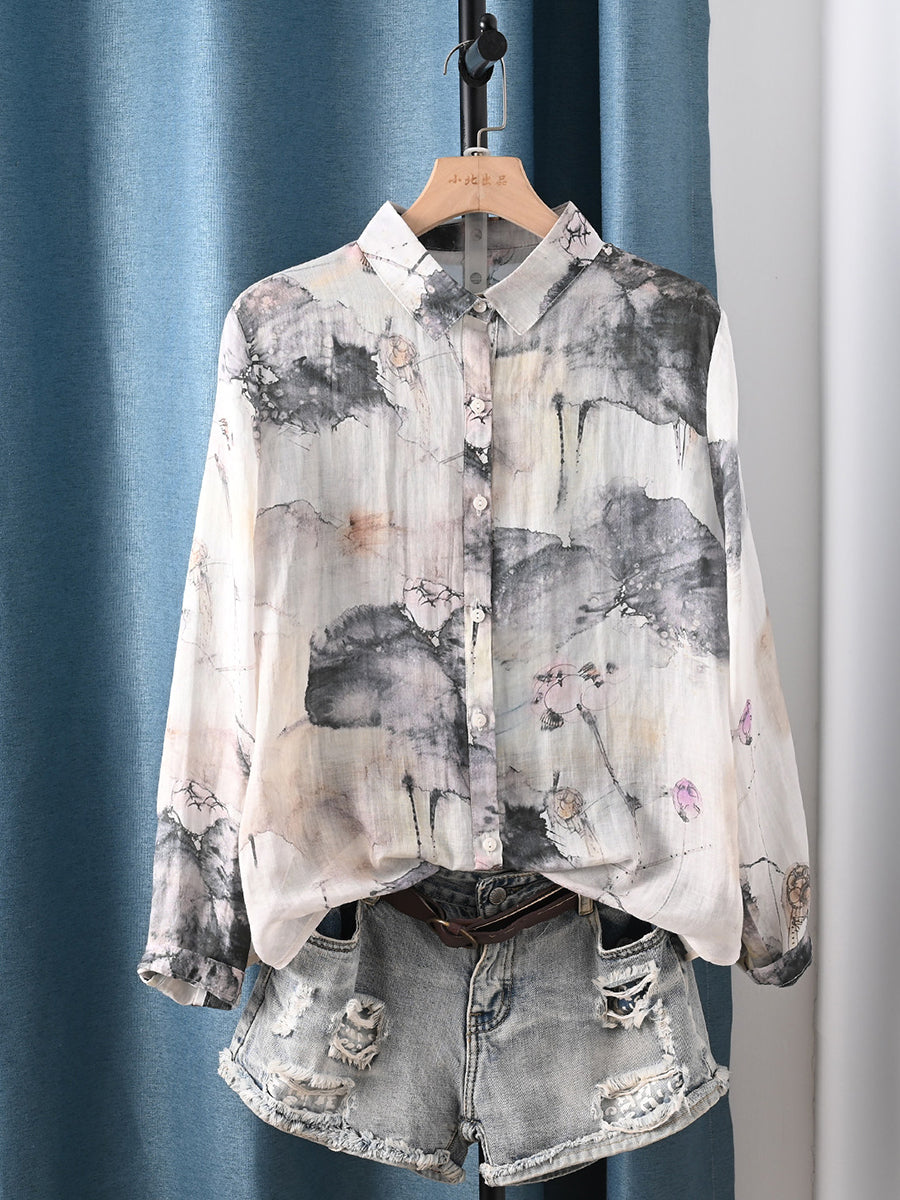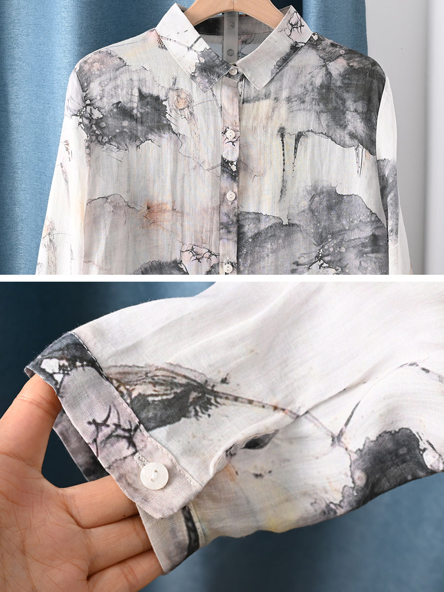 Camicia da donna con stampa a inchiostro primaverile 100% ramiè