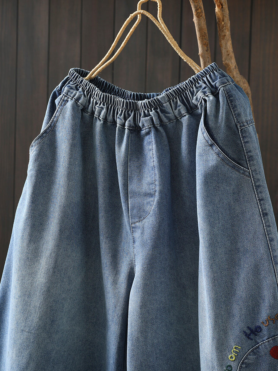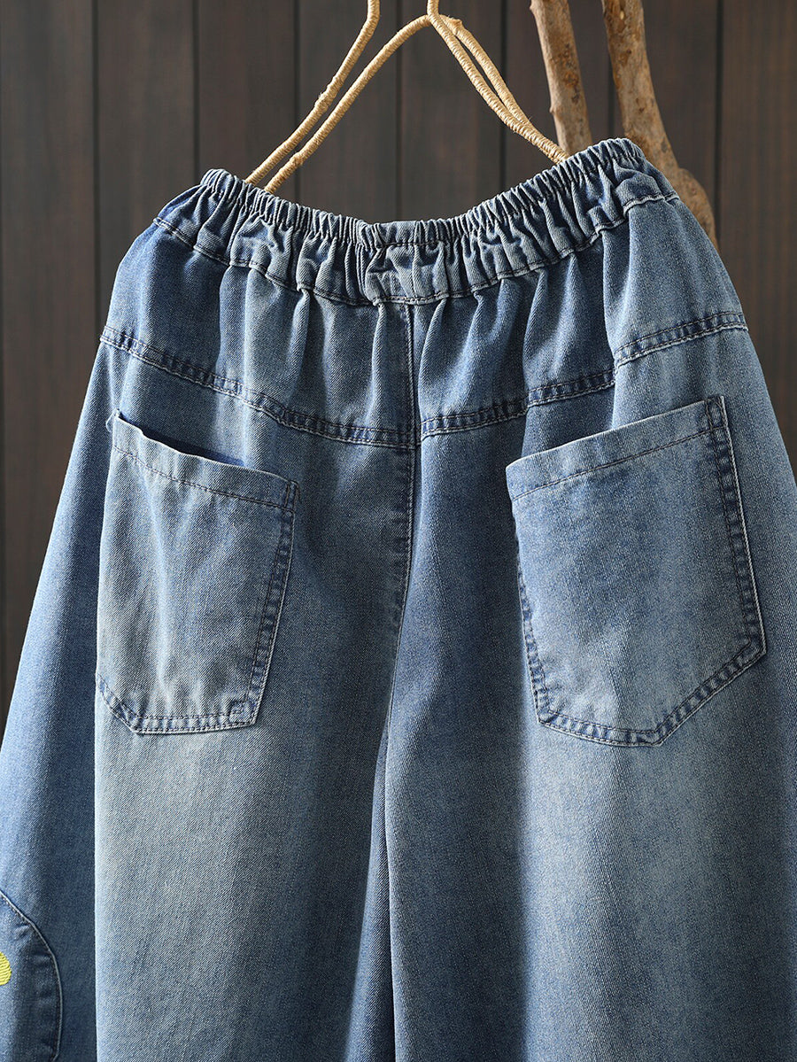 Pantaloni larghi in denim con ricamo retrò primaverile da donna