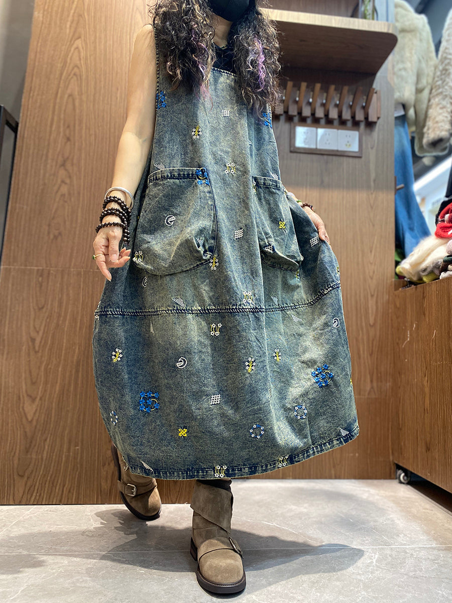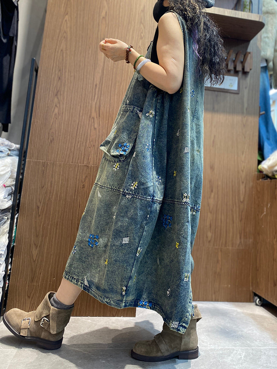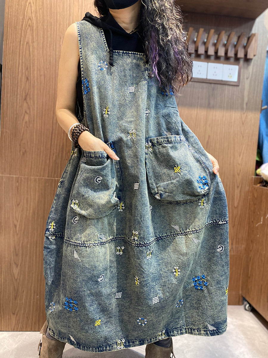 Abito da donna in denim con ricamo floreale retrò primaverile