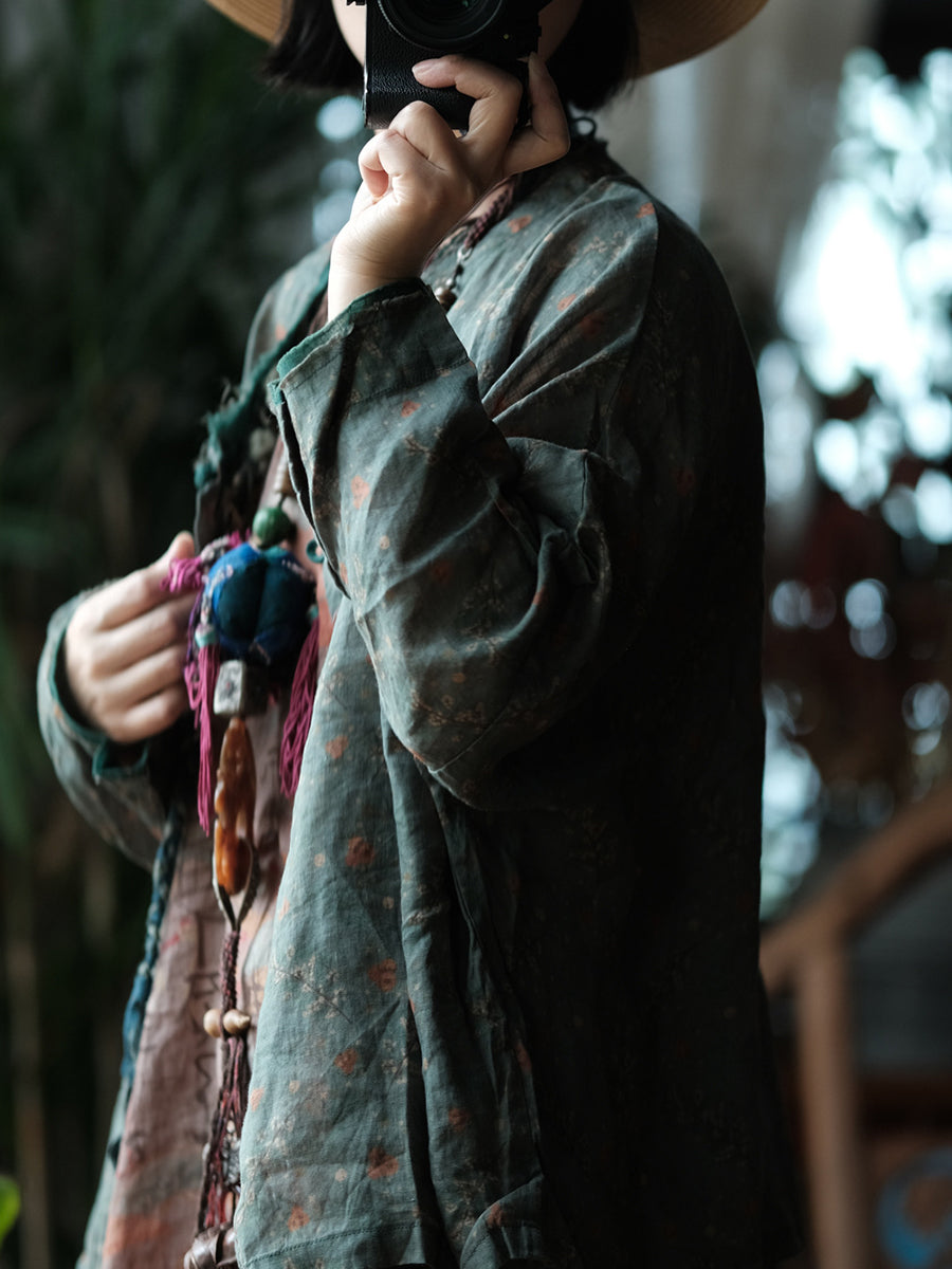 Camicia da donna in lino con scollo a V e stampa floreale retrò primaverile