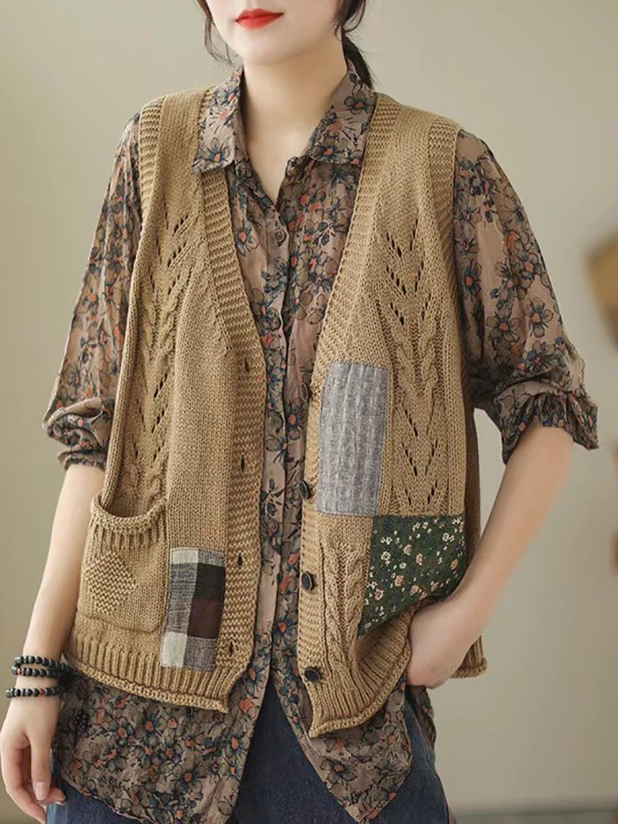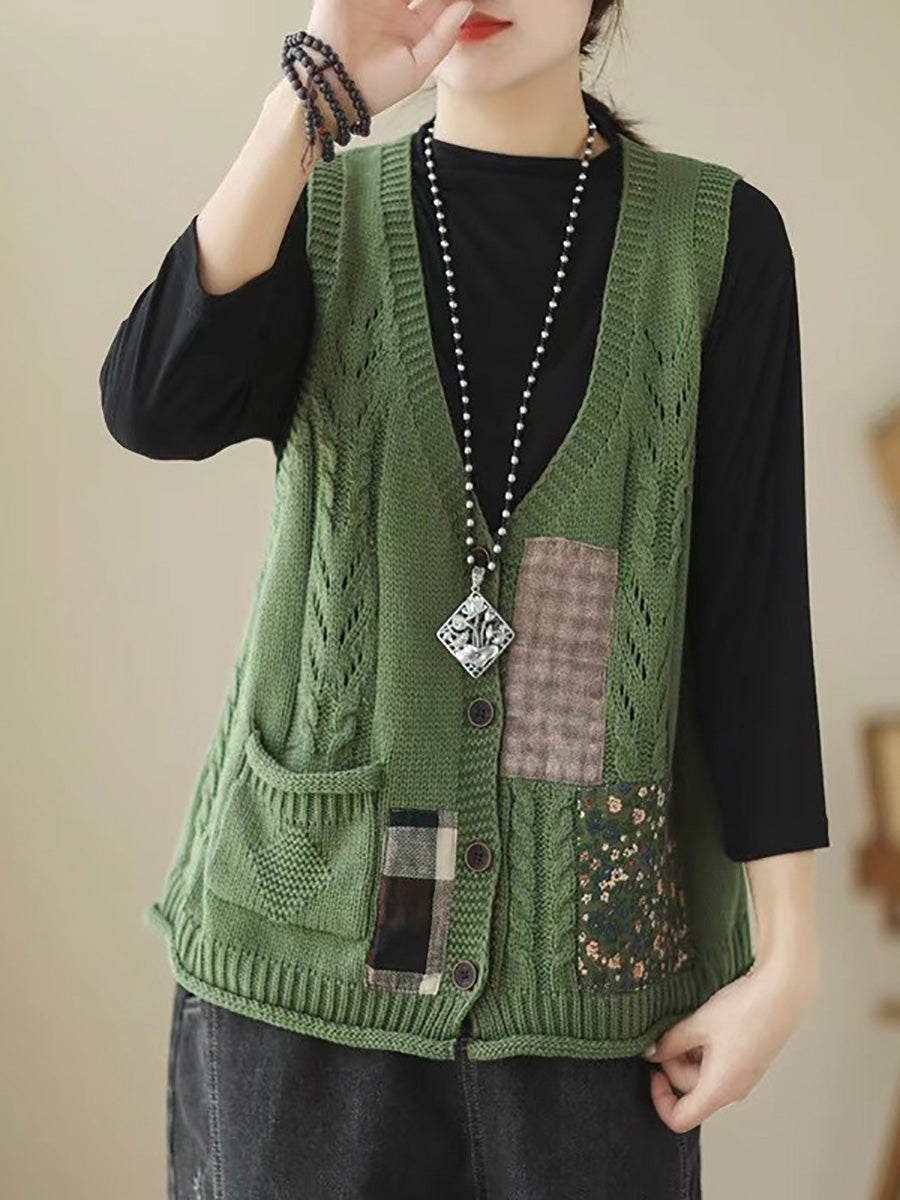 Questo gilet lavorato a maglia presenta un design patchwork e un classico colletto a V, che gli conferisce un tocco retrò. Perfetto per le stagioni autunnali e invernali.
