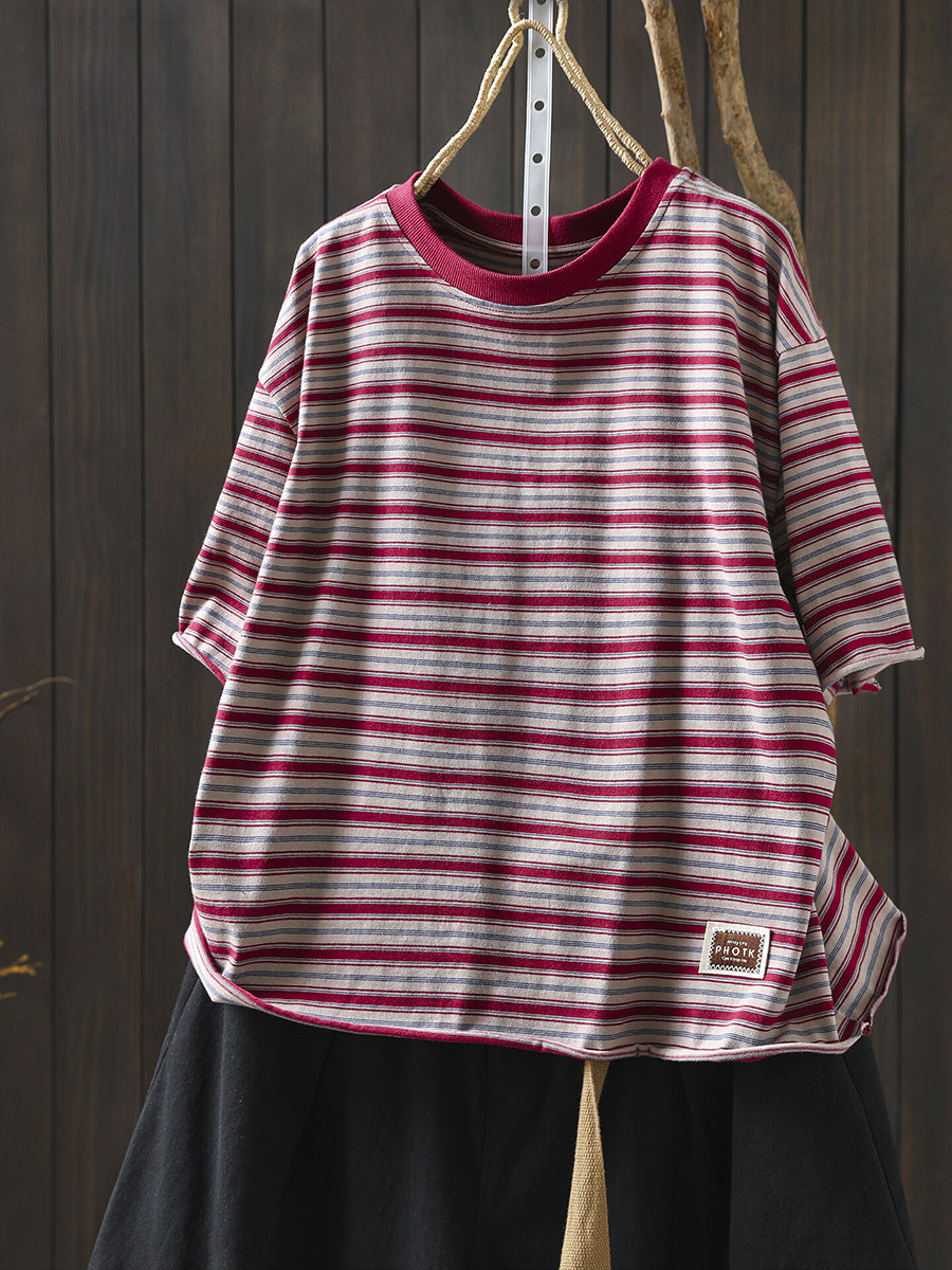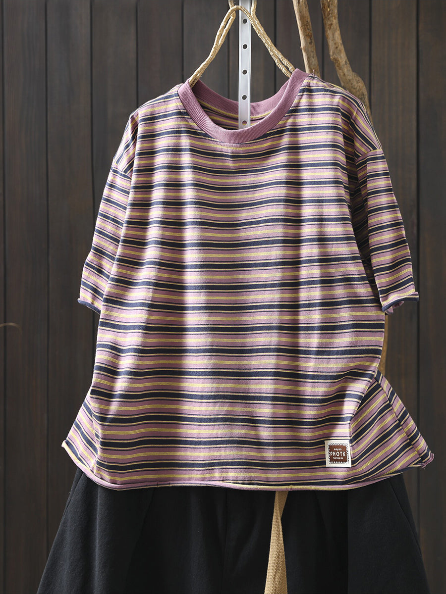 Camicia da donna a righe primaverili, 100% cotone, con scollo a O.