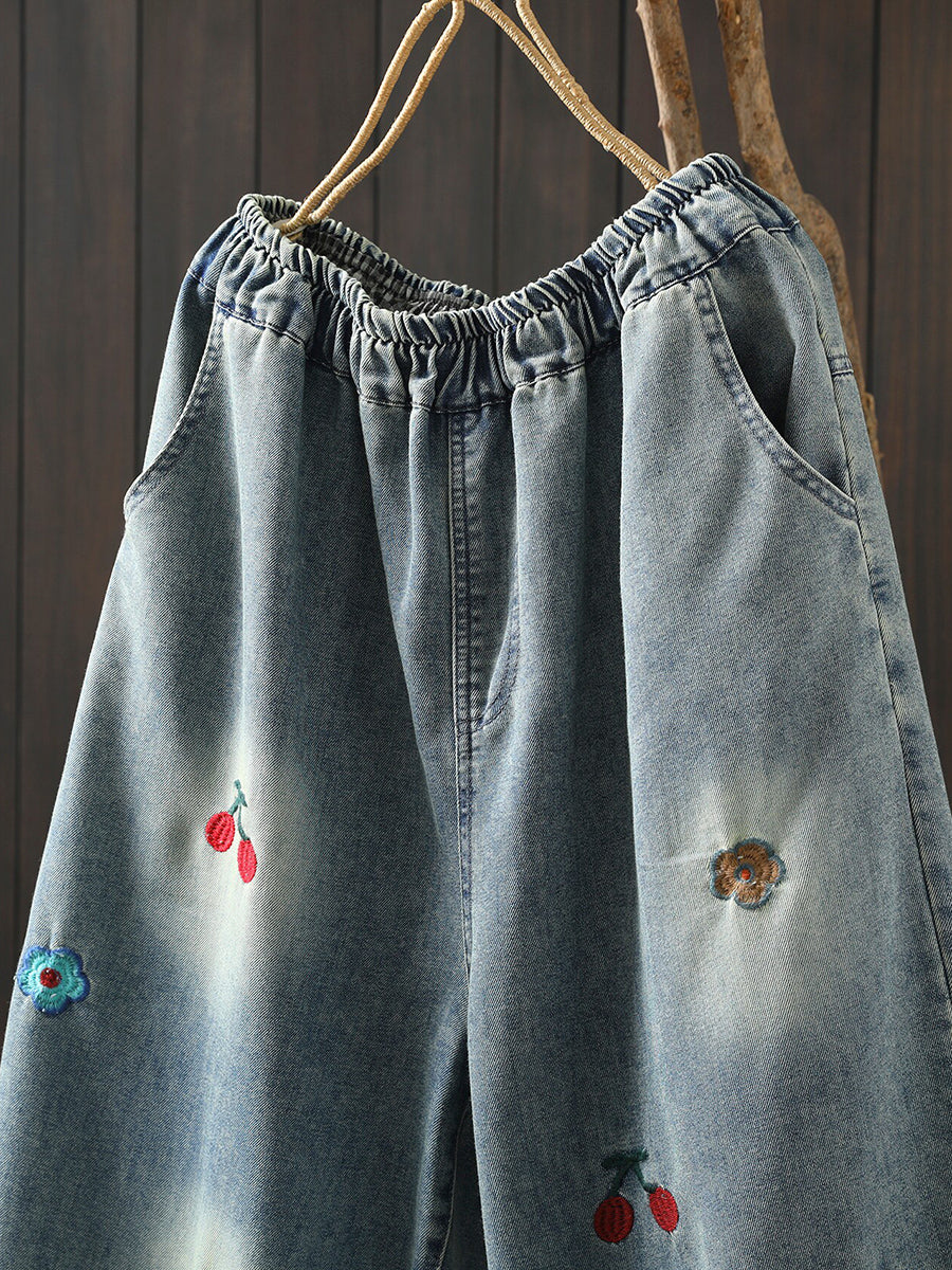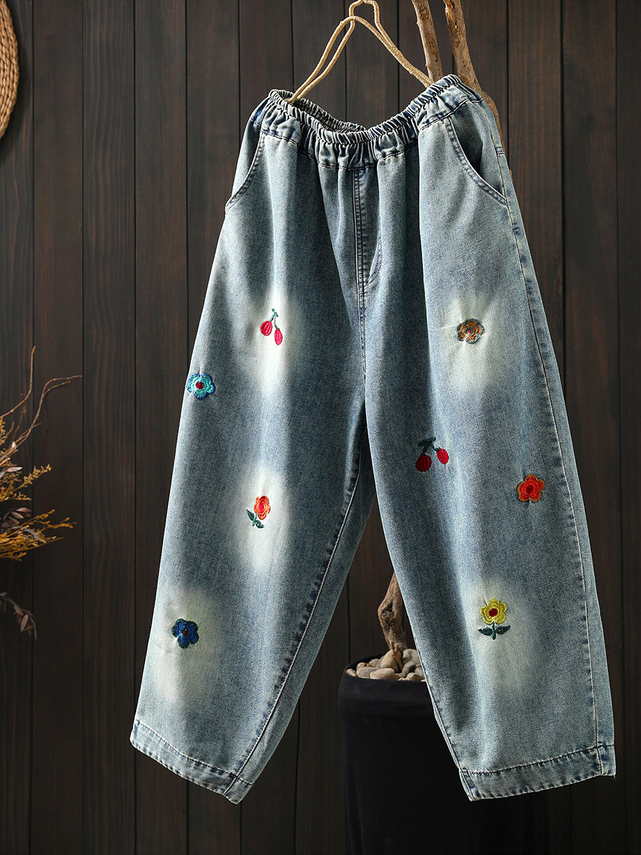 Pantaloni harem da donna in denim vintage con ricamo primaverile