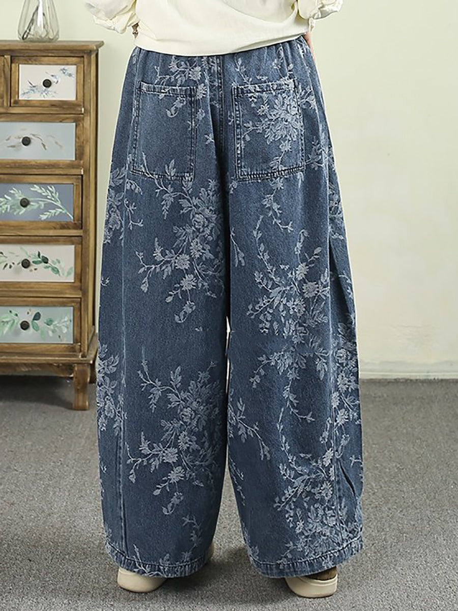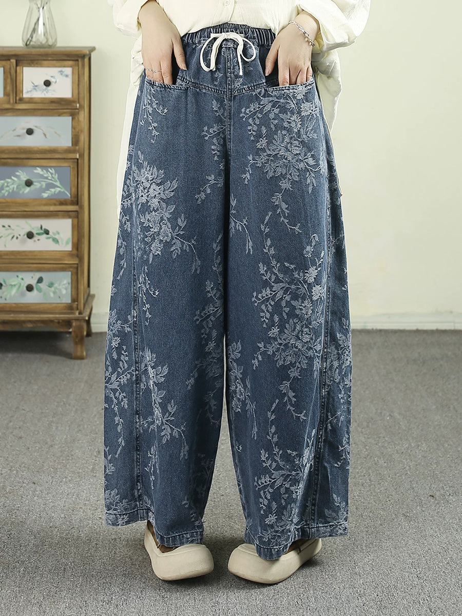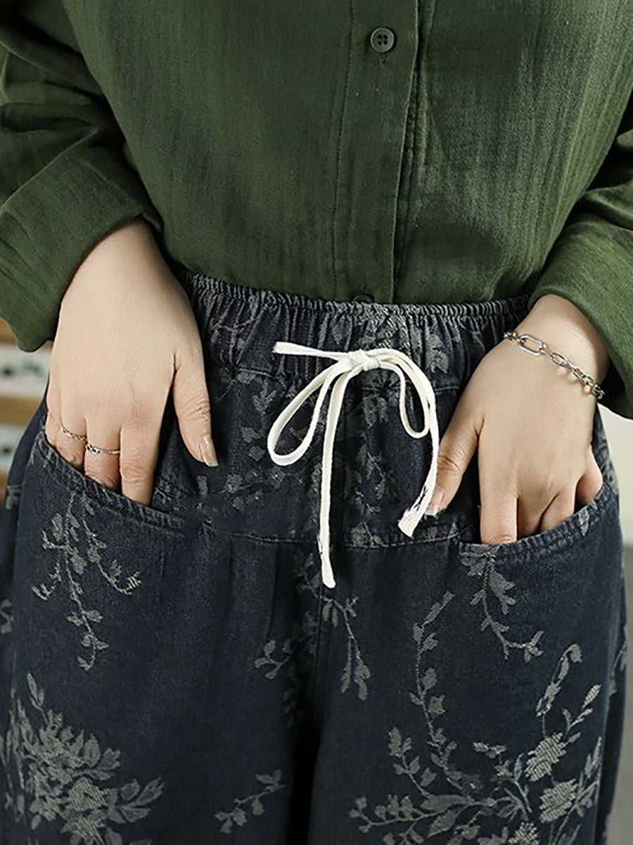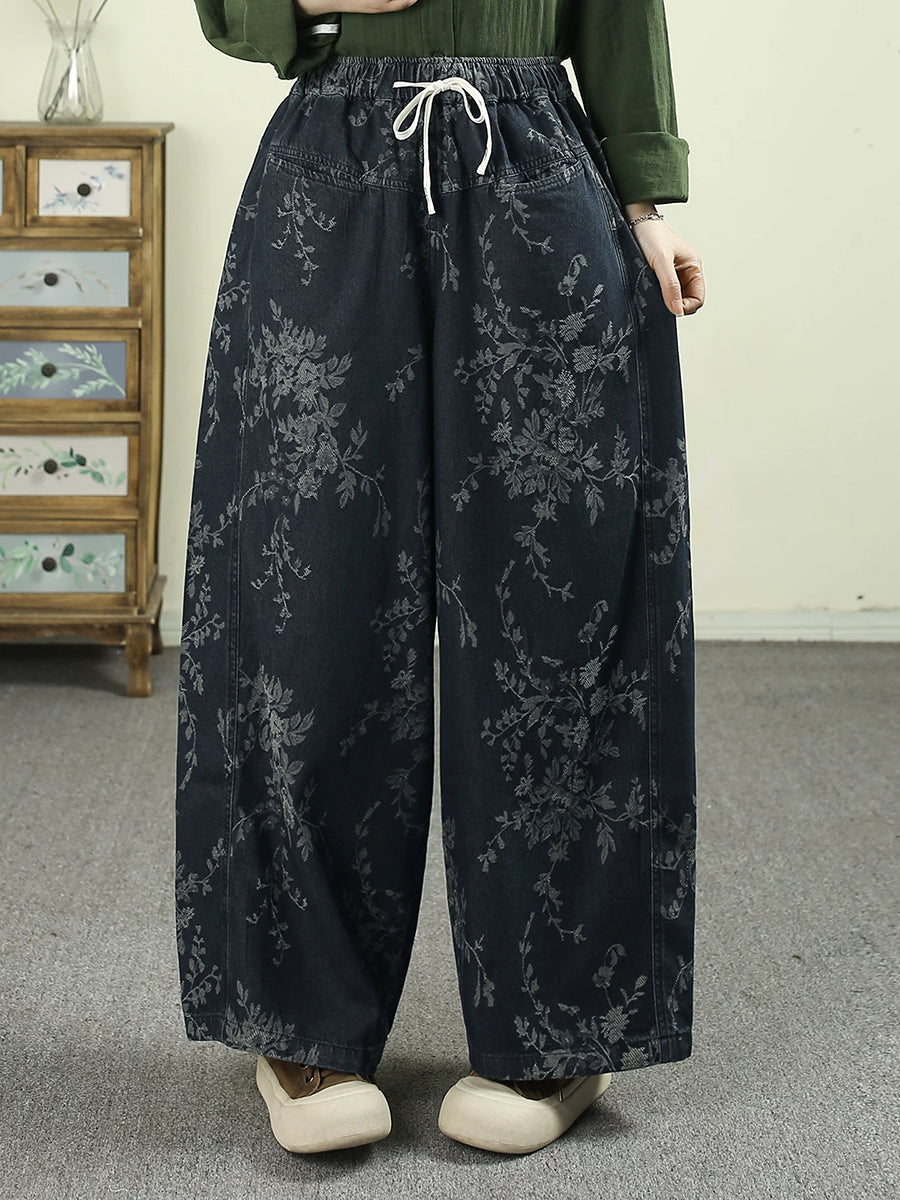Pantaloni larghi in cotone con fiori vintage primaverili da donna