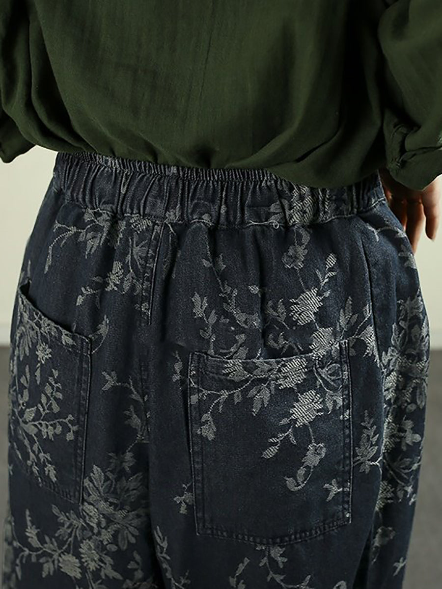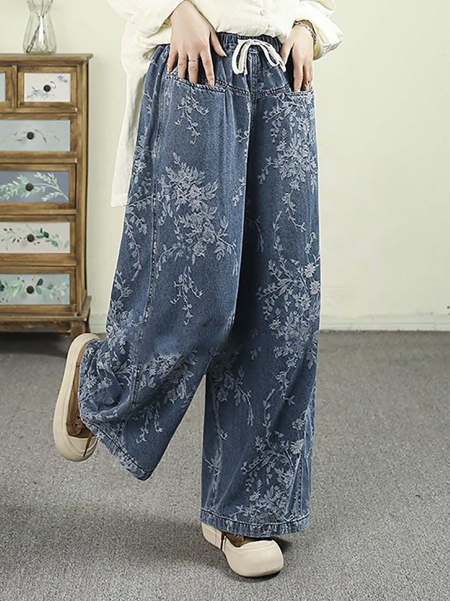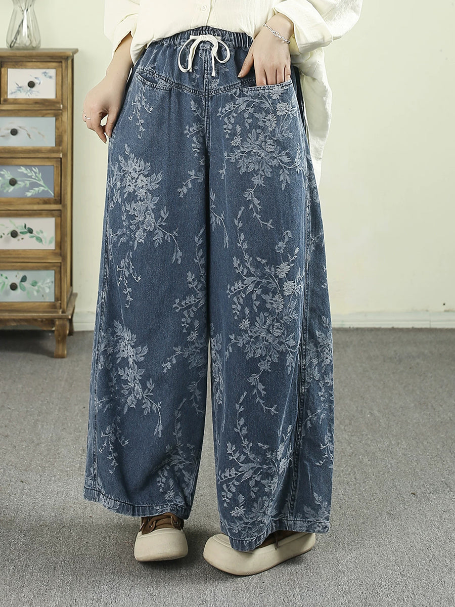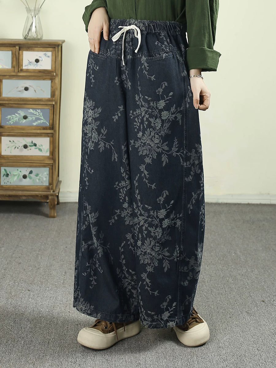 Pantaloni larghi in cotone con fiori vintage primaverili da donna