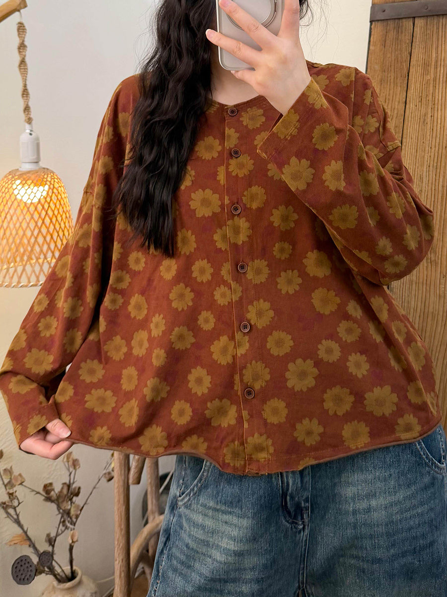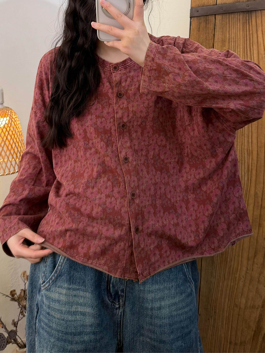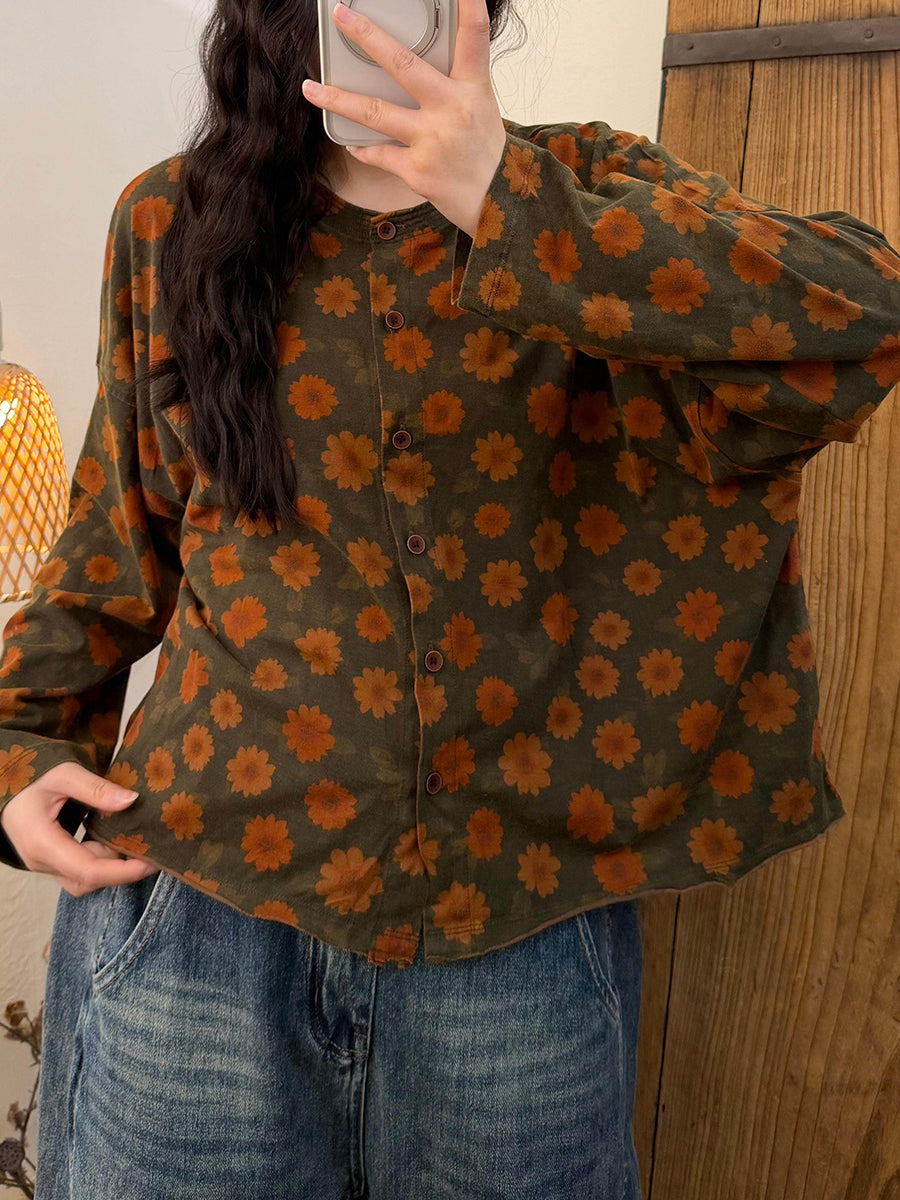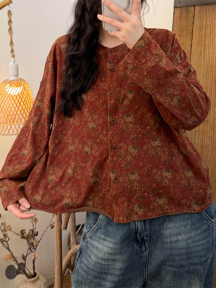 Maglietta da donna con scollo a V e motivo floreale vintage primaverile