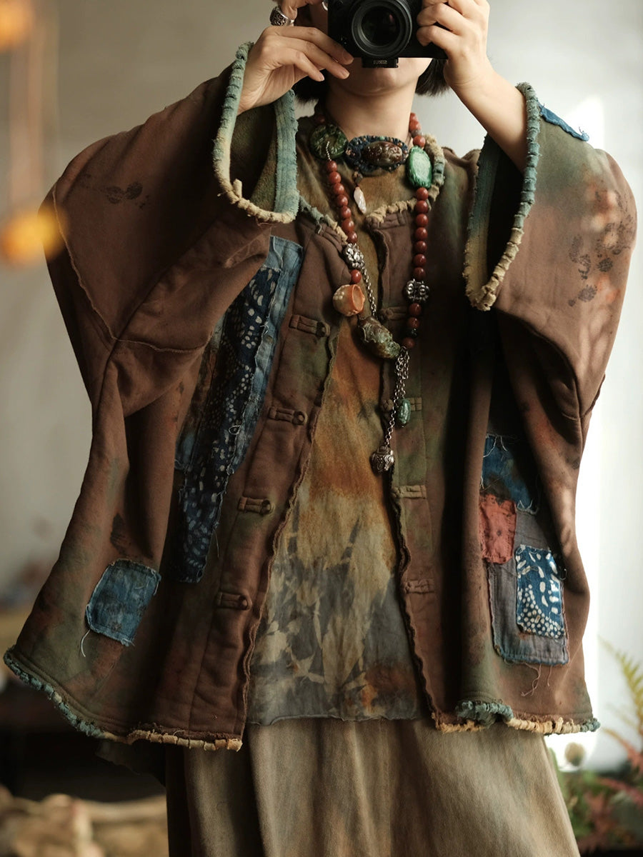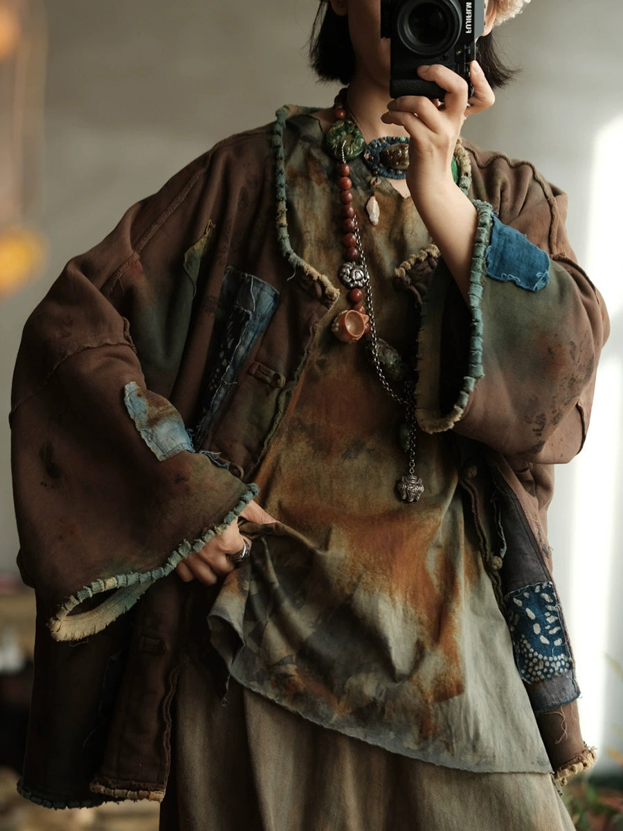 Cappotto con scollo a V patchwork vintage da donna primaverile