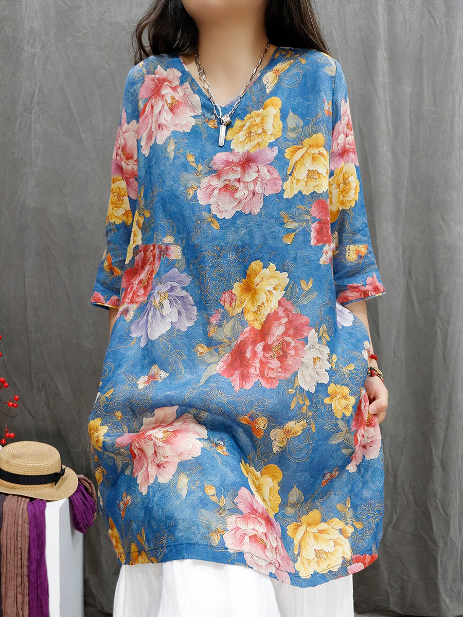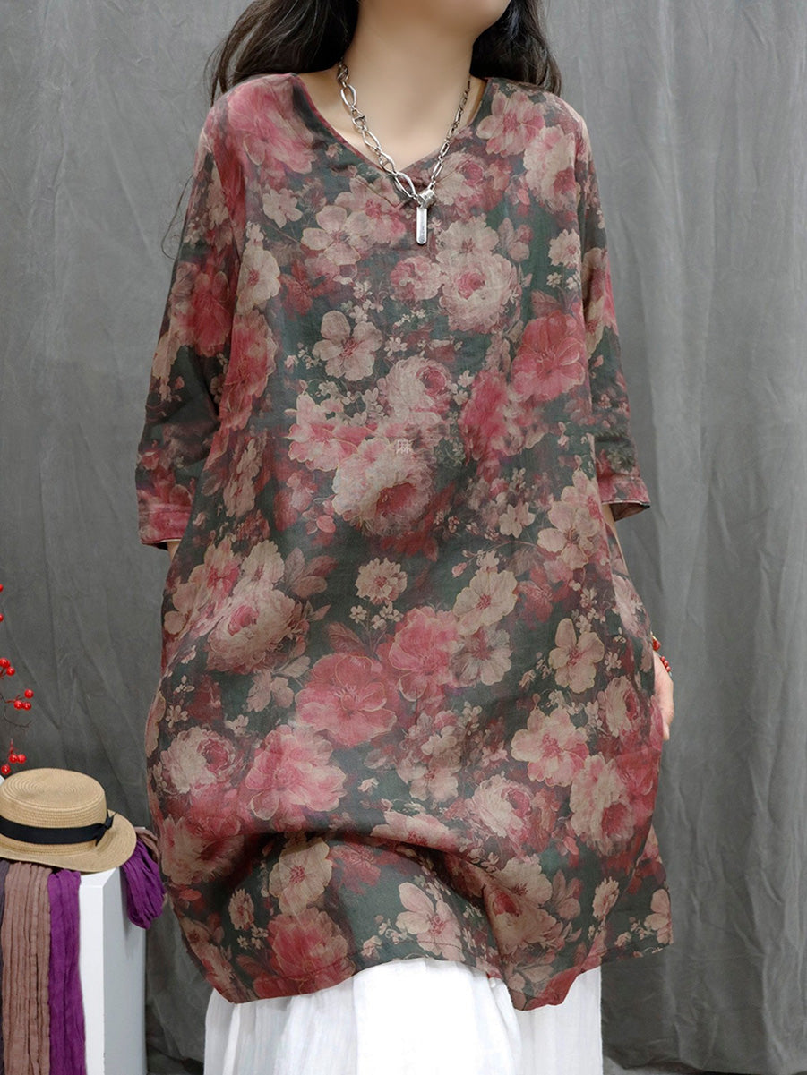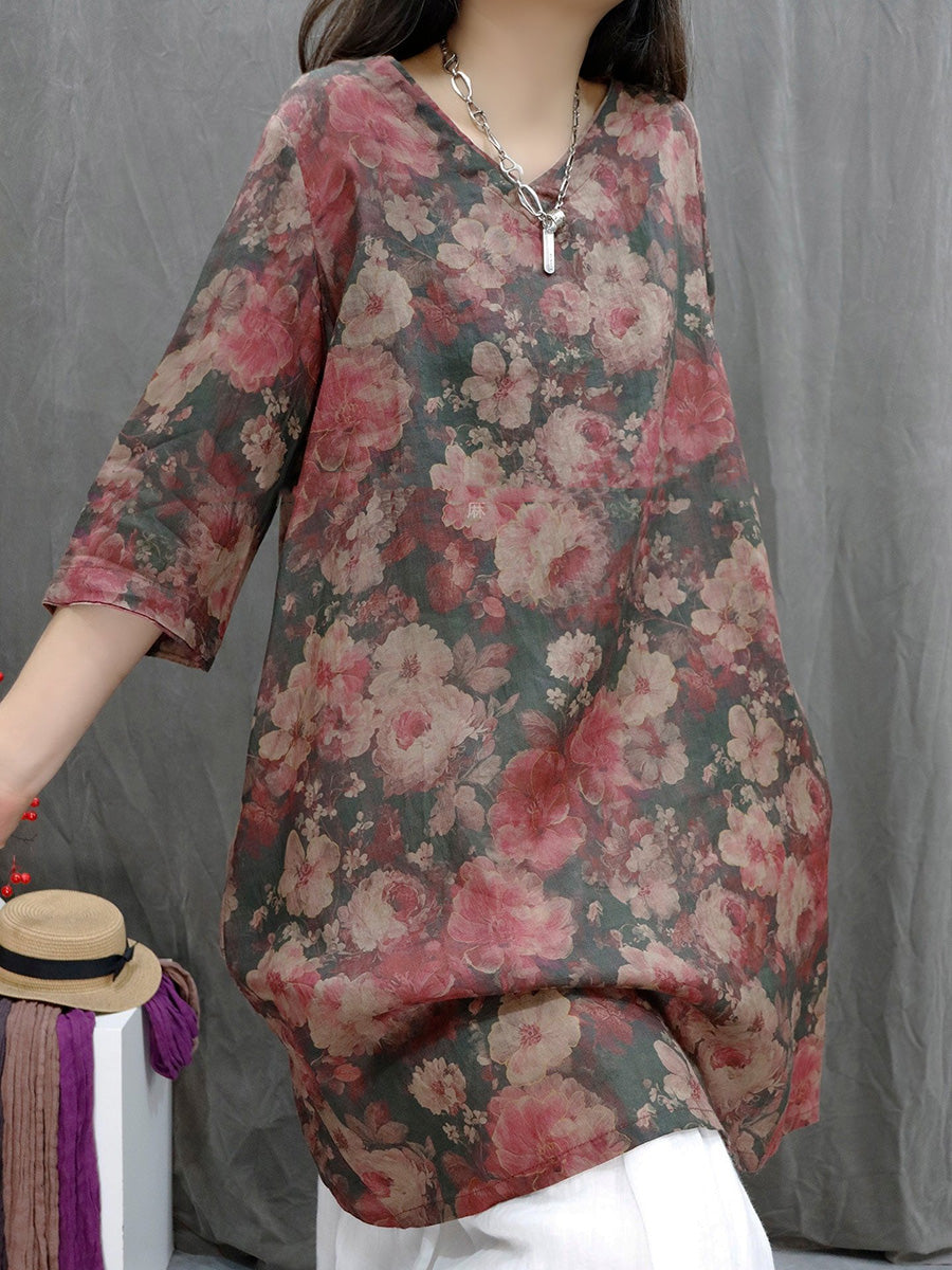 Camicia estiva da donna con scollo a V e motivo floreale in 100% ramia