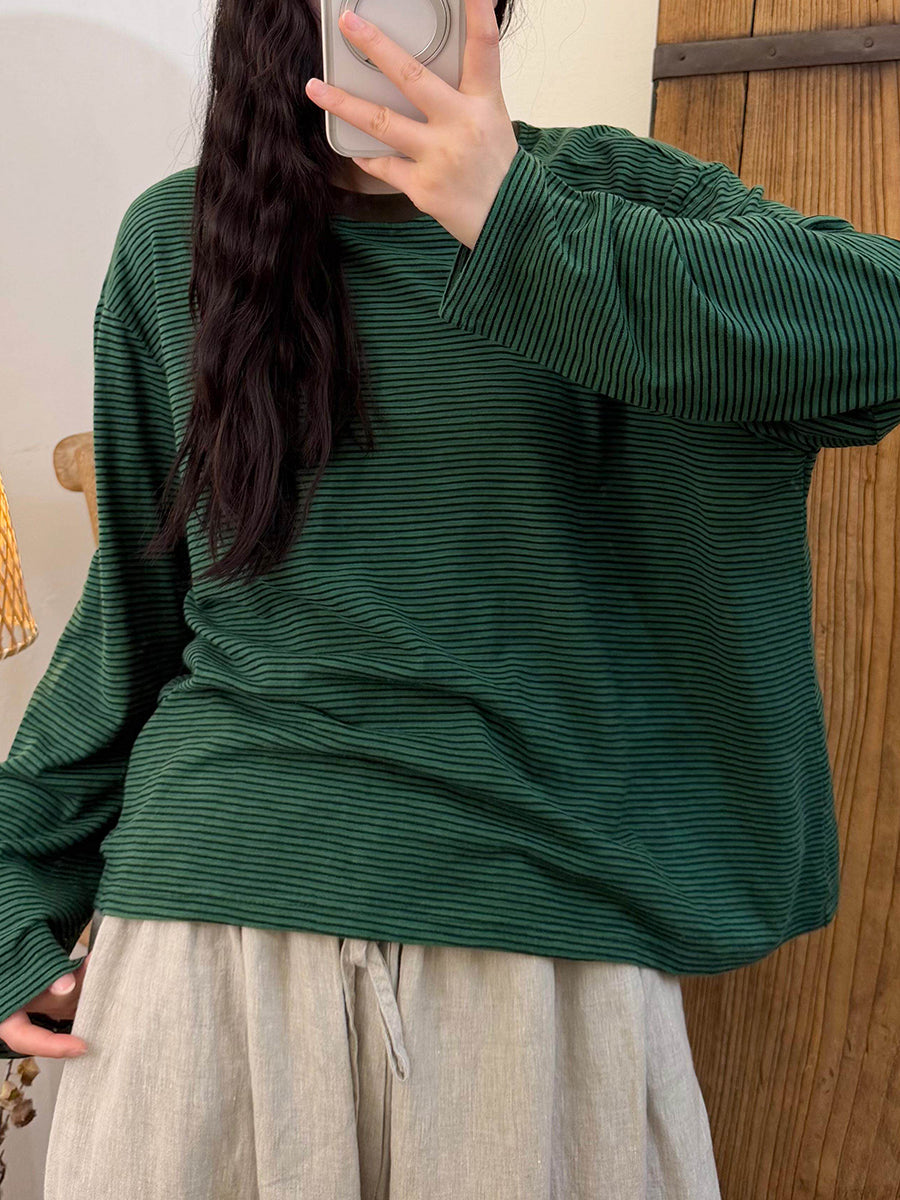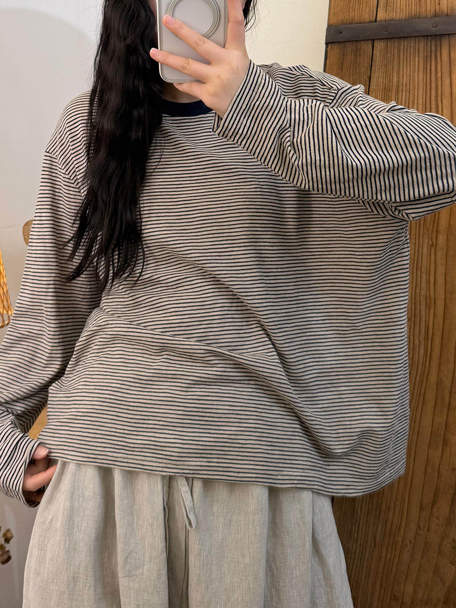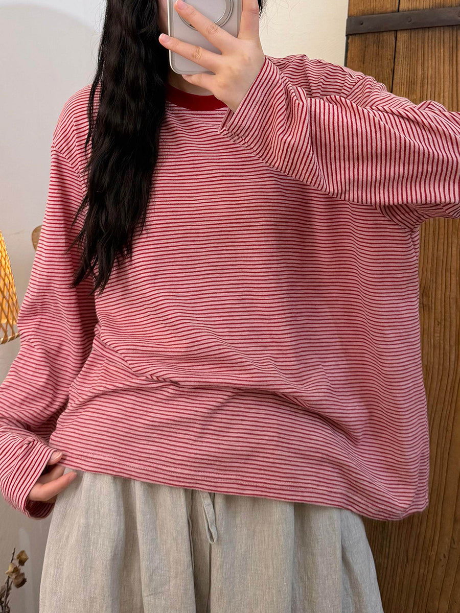 Camicetta da donna estiva casual a righe con scollo a O in cotone