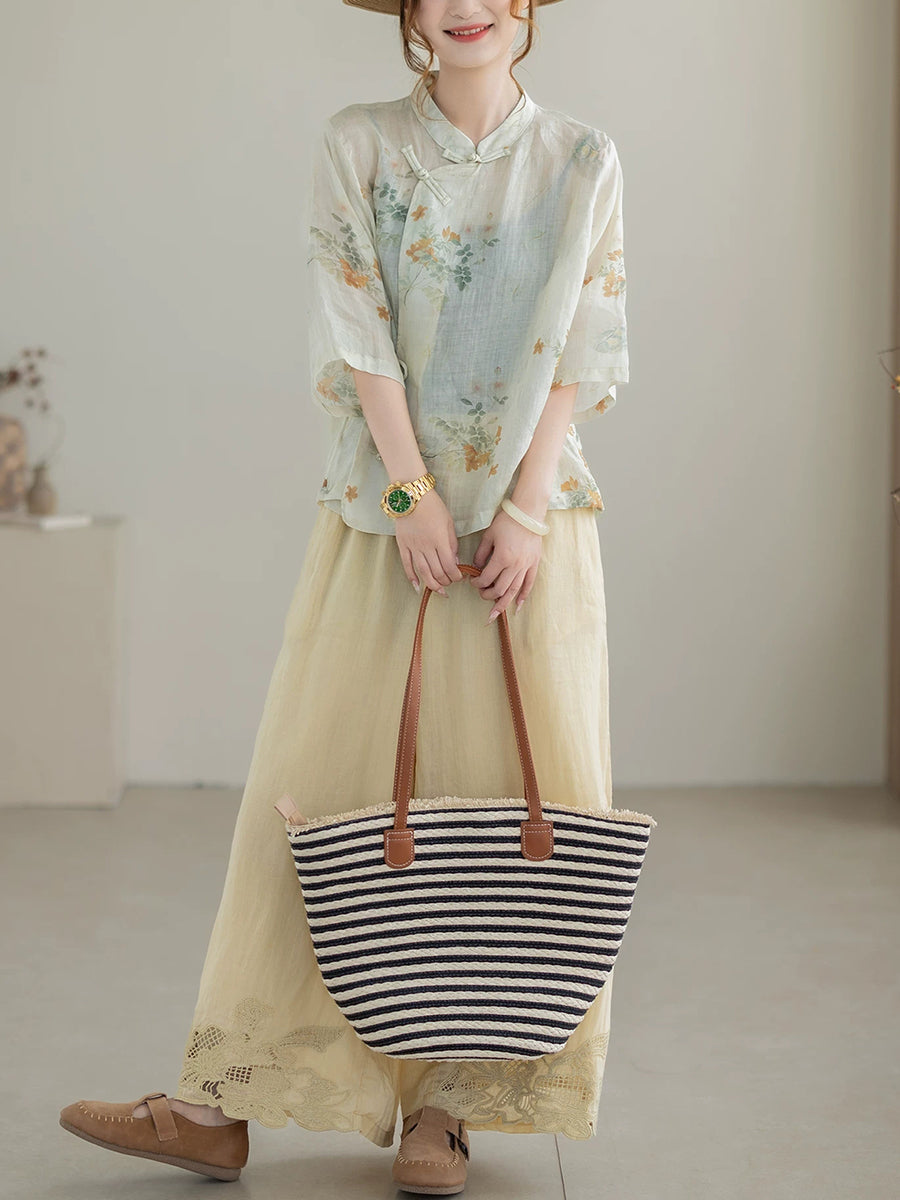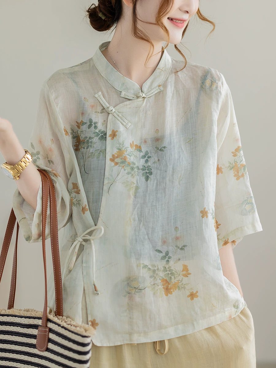 Camicetta da donna estiva etnica con colletto alto e motivo floreale, 100% ramia