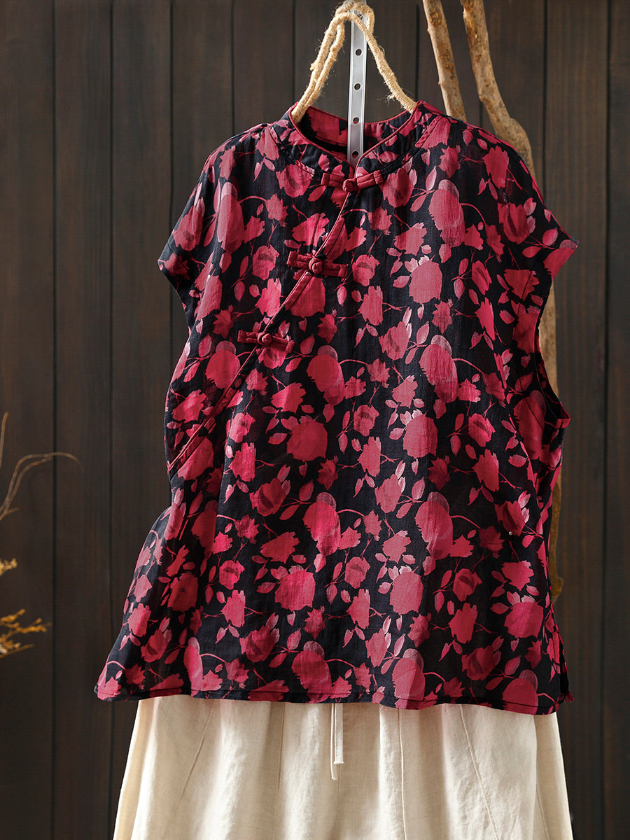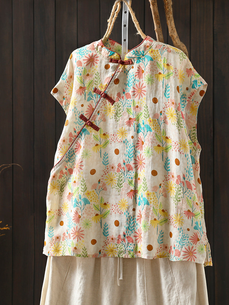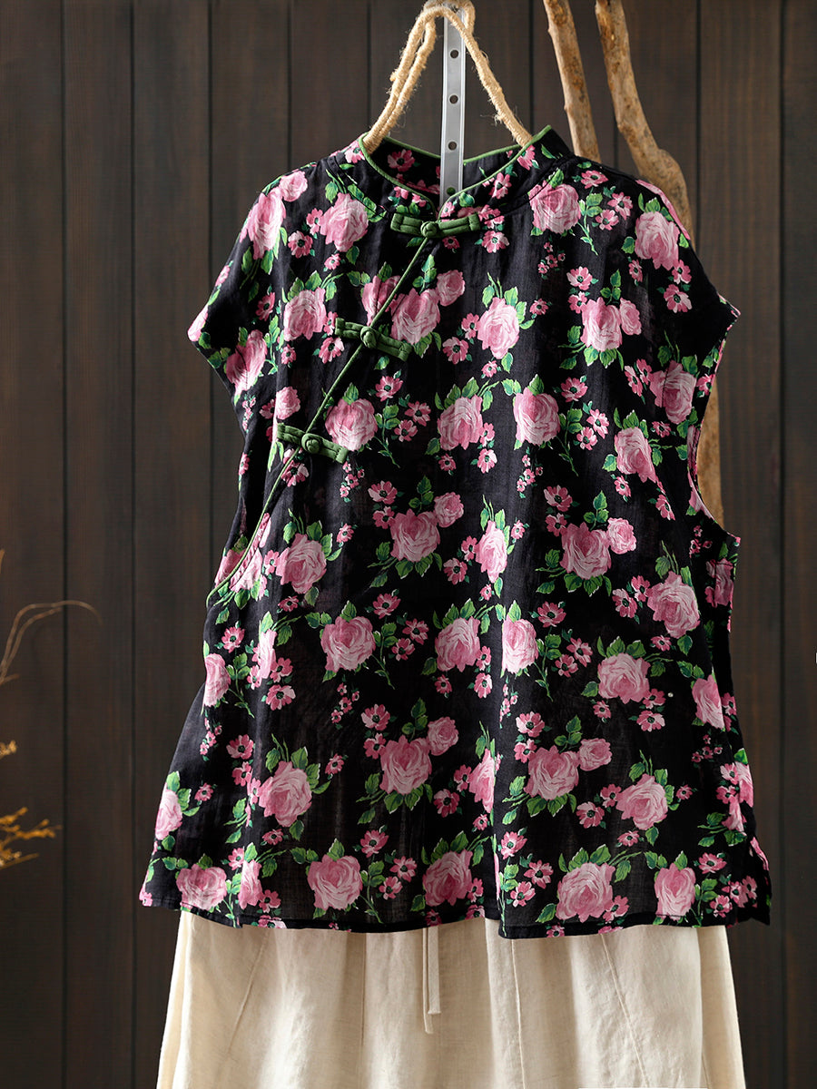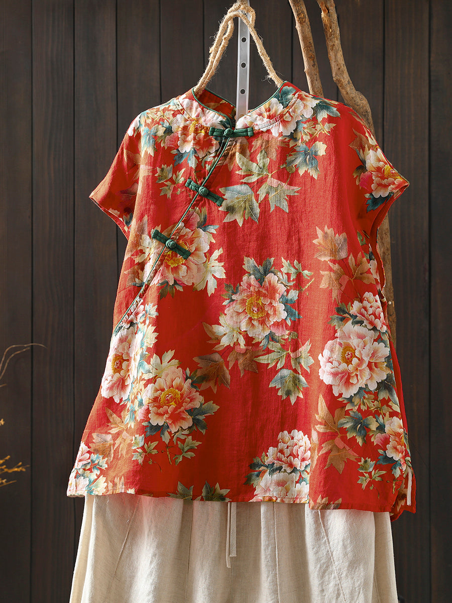 Camicetta da donna estiva etnica con colletto alla coreana e motivo floreale.