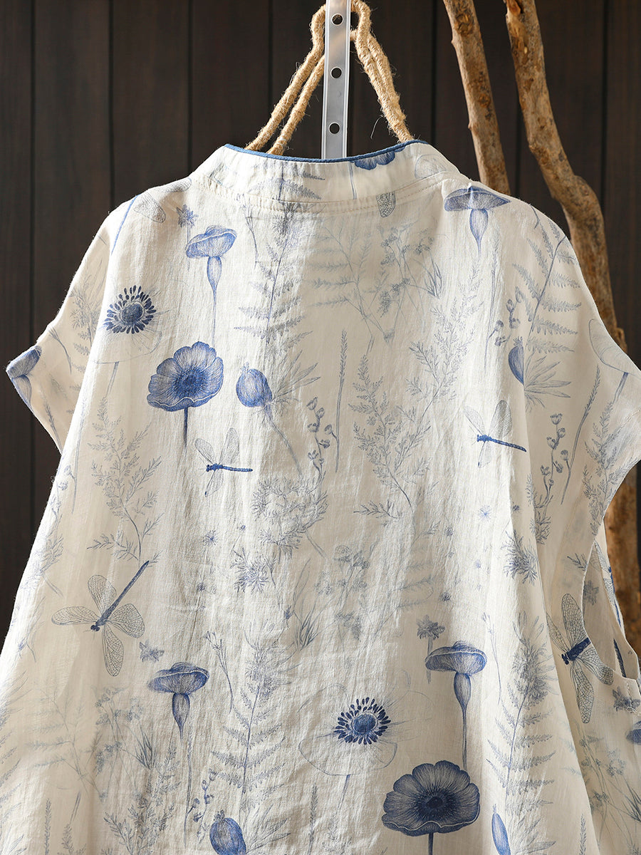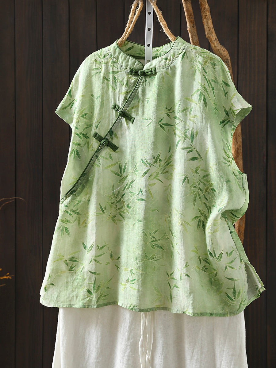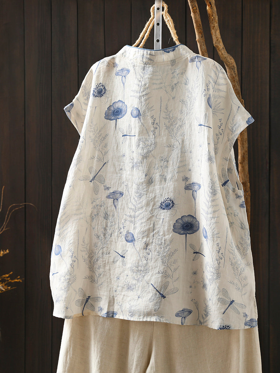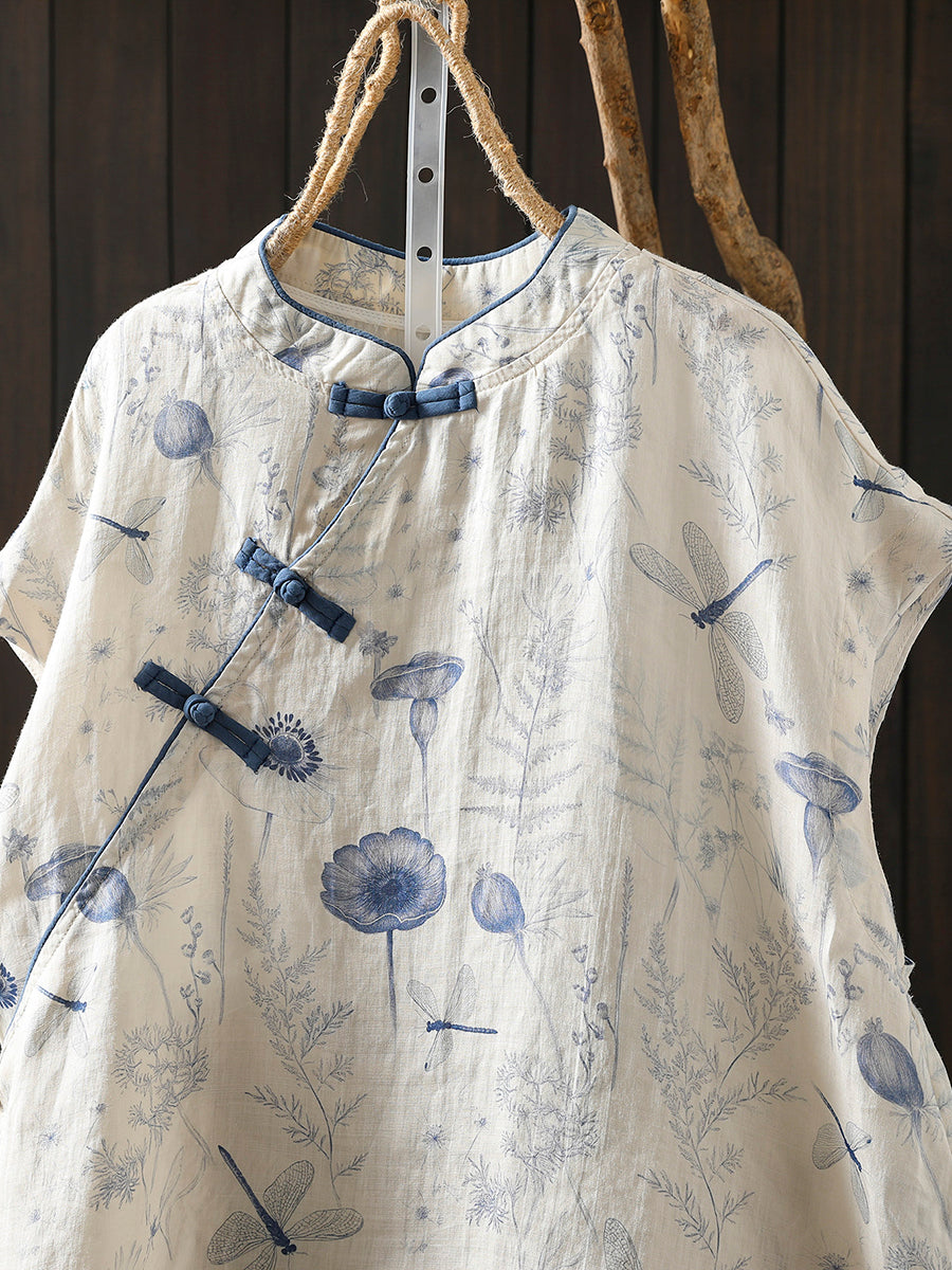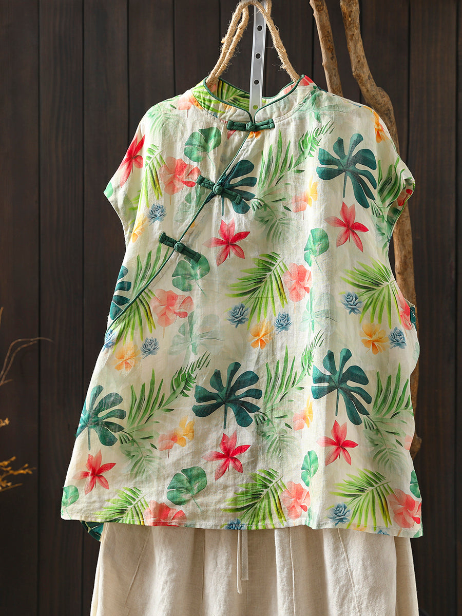 Camicetta da donna estiva etnica con colletto alla coreana e motivo floreale.