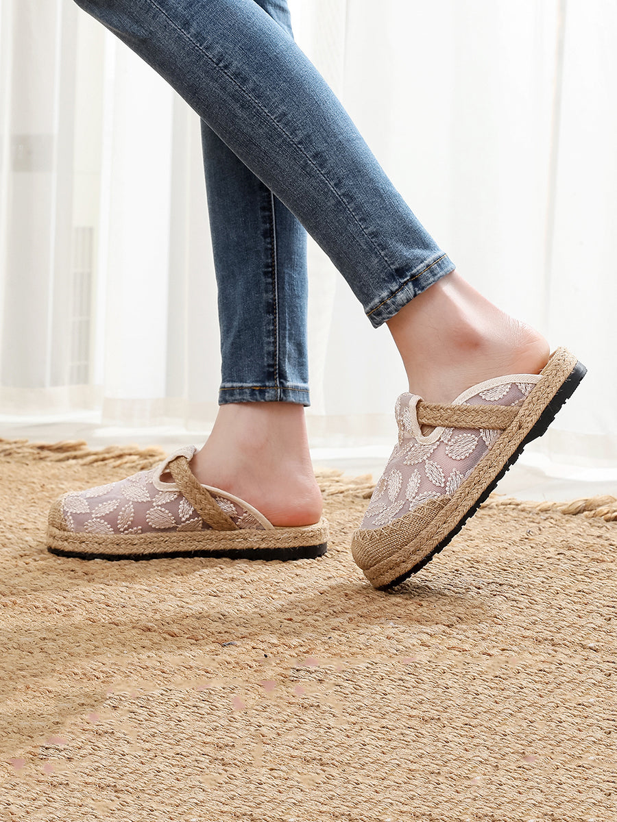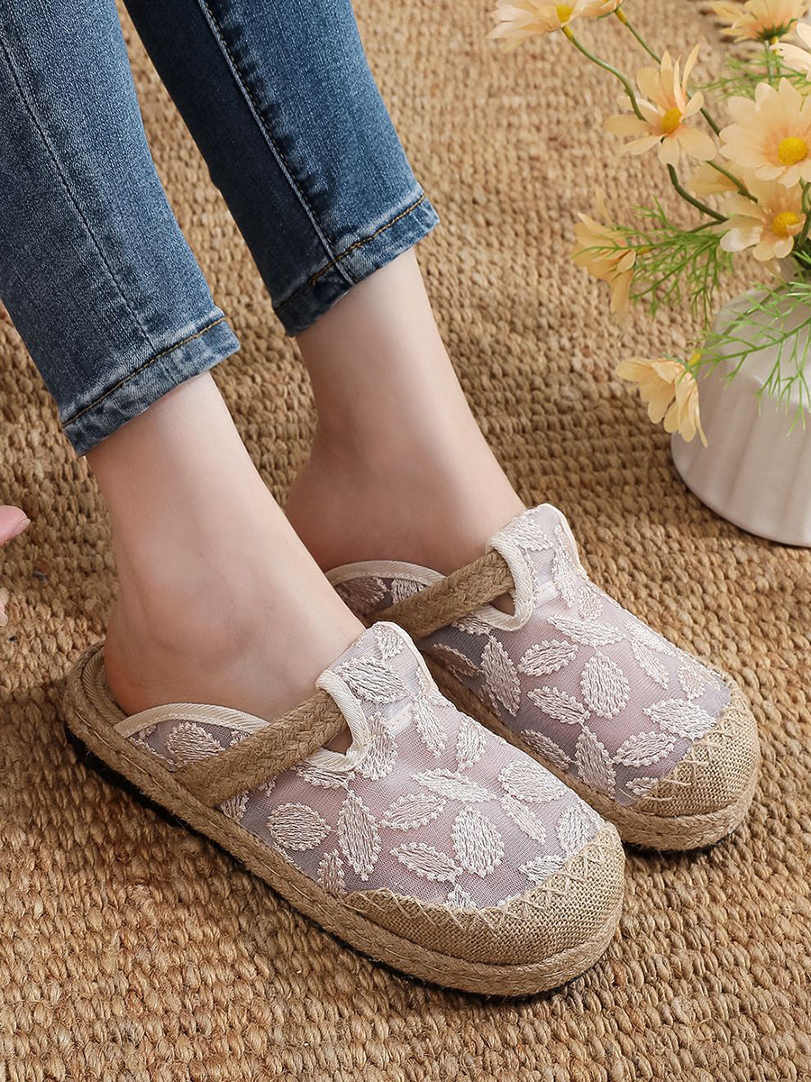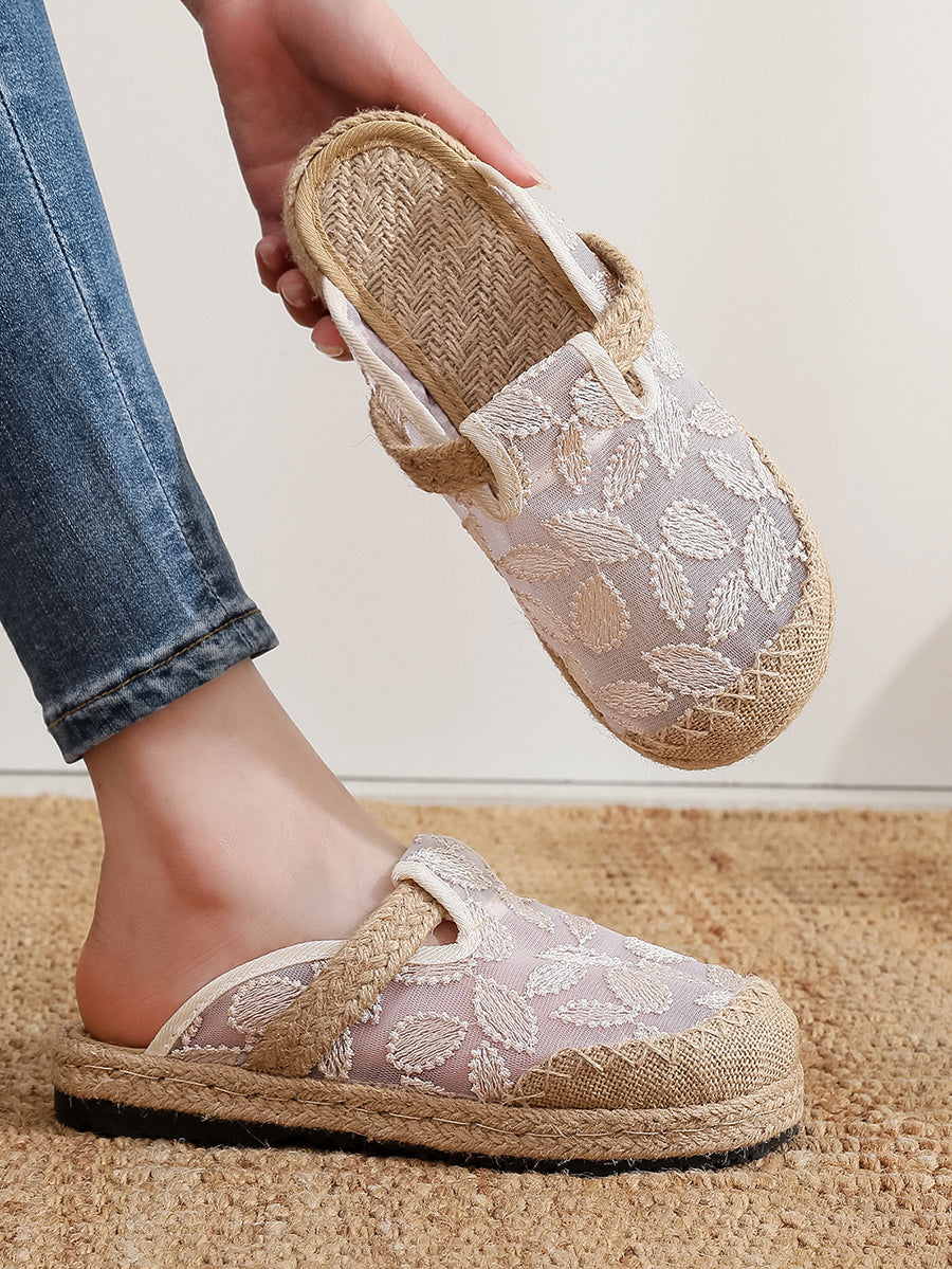 Pantofole estive da donna in lino etnica con inserti in tessuto a rete e foglie