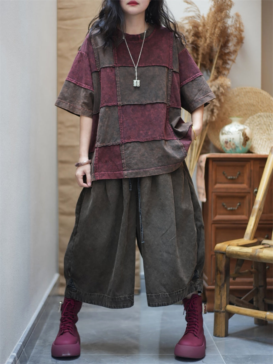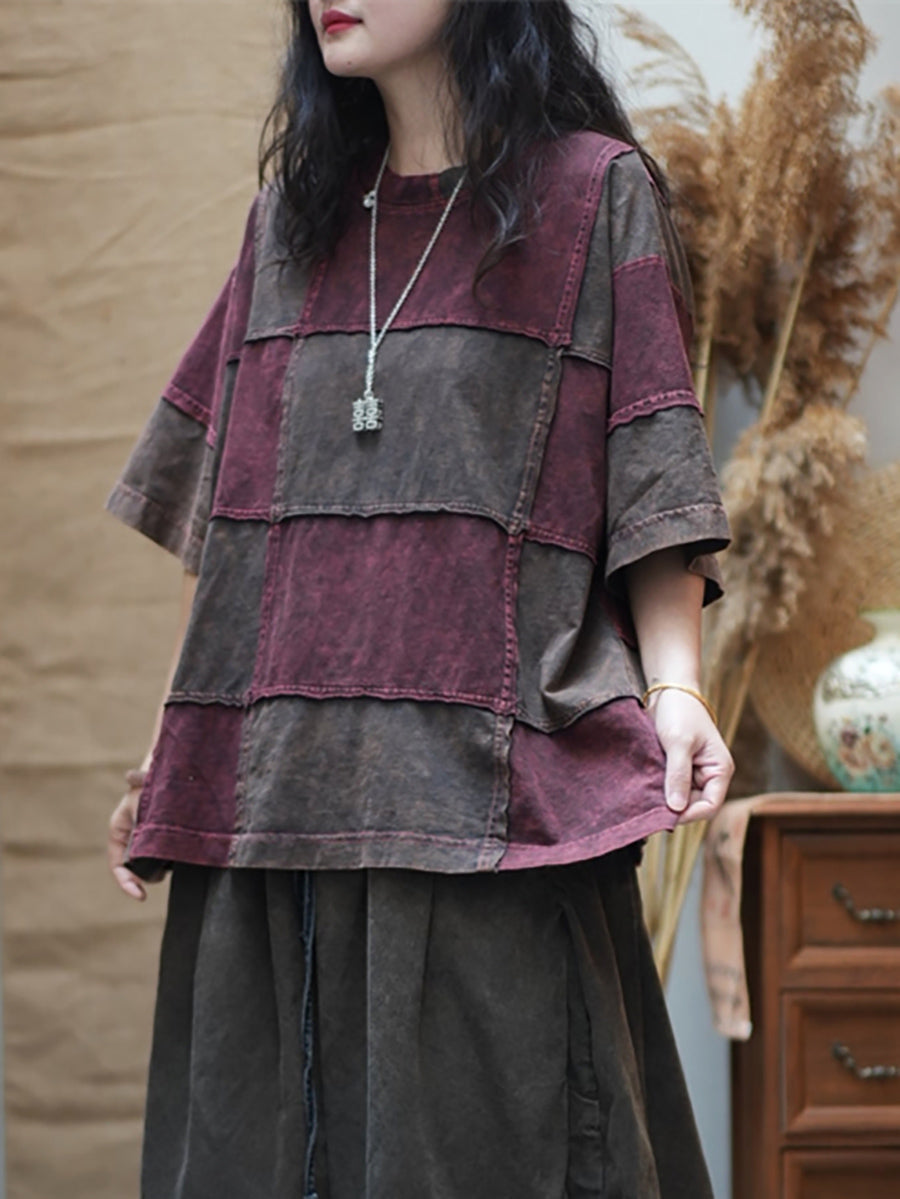 Camicia da donna estiva retrò in cotone con scollo a V e motivo a quadri colorblock