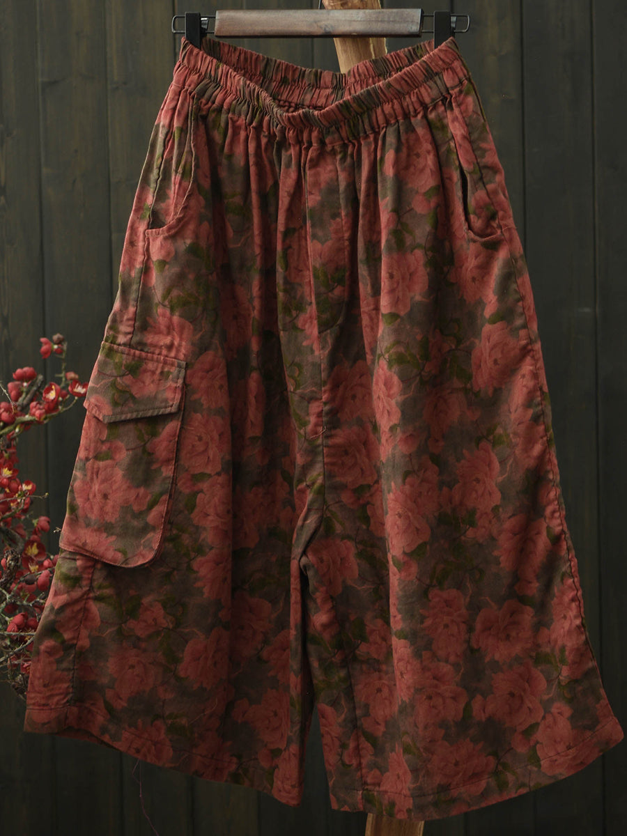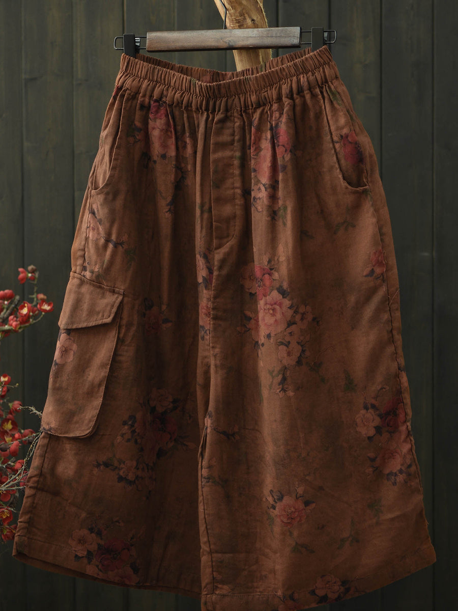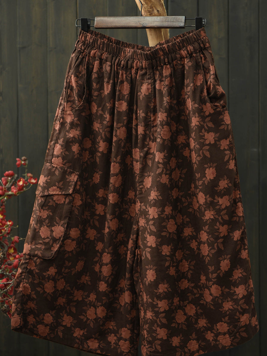 Pantaloni da donna estivi in cotone a gamba larga con stampa floreale retrò.