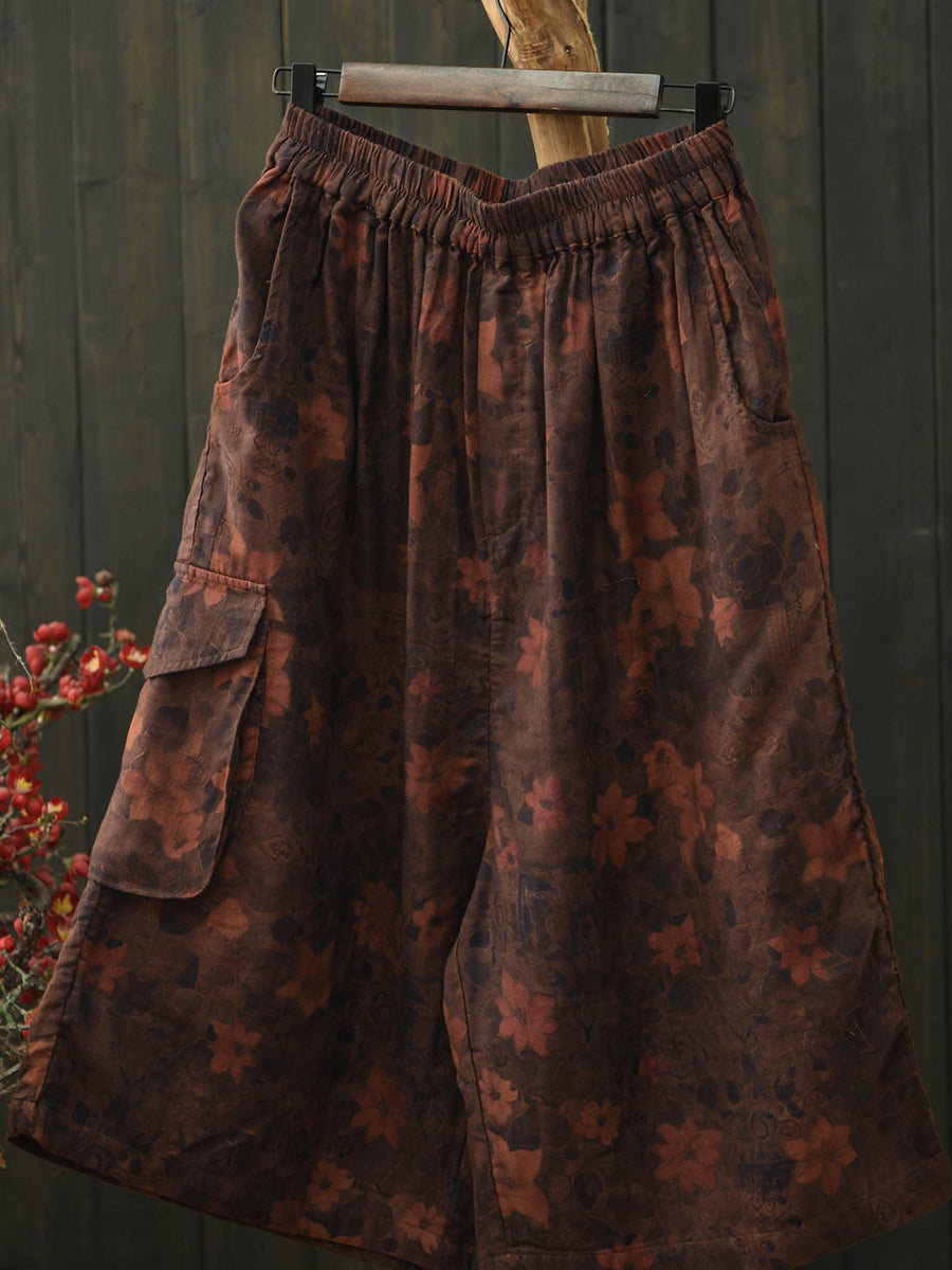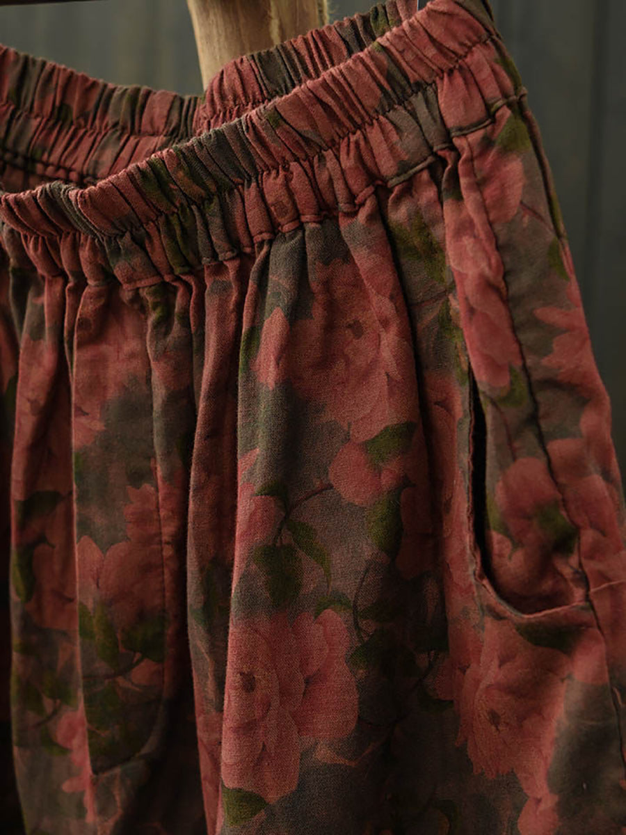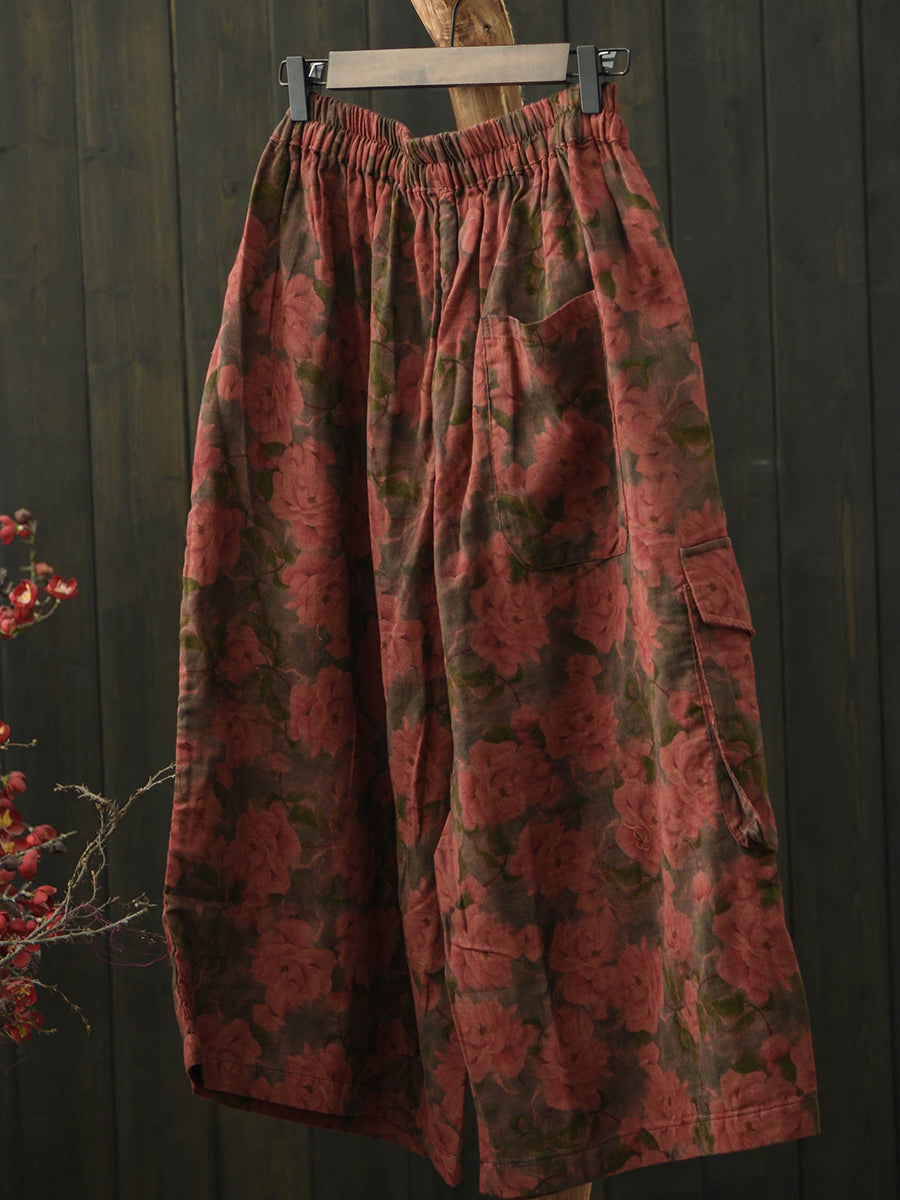Pantaloni da donna estivi in cotone a gamba larga con stampa floreale retrò.