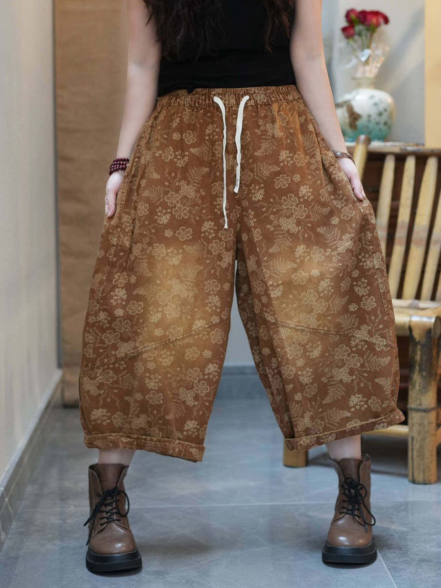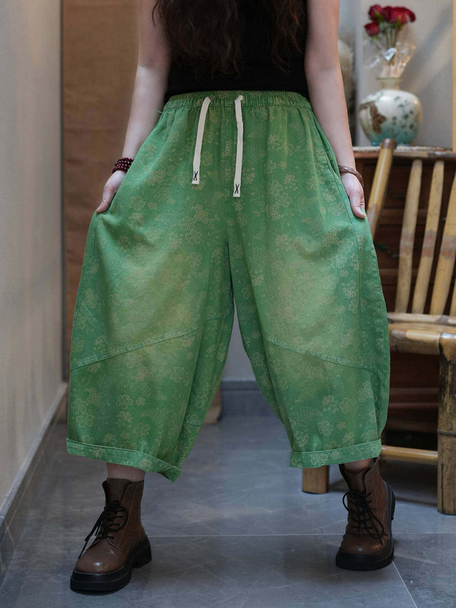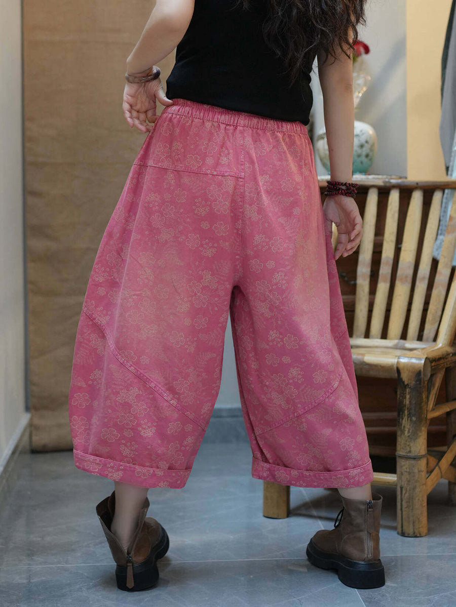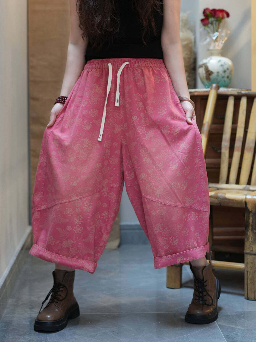 Pantaloni da donna estivi a gamba larga con stampa floreale retrò.