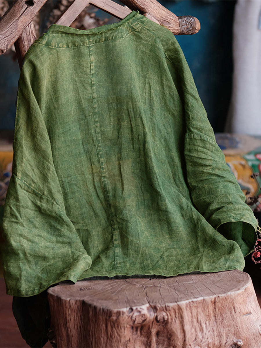 Questo cappotto è realizzato in 100% lino, con una fantasia a tinta unita e un colletto a V. Le maniche raglan lunghe aggiungono un tocco vintage, rendendolo perfetto per le stagioni primaverili ed estive.