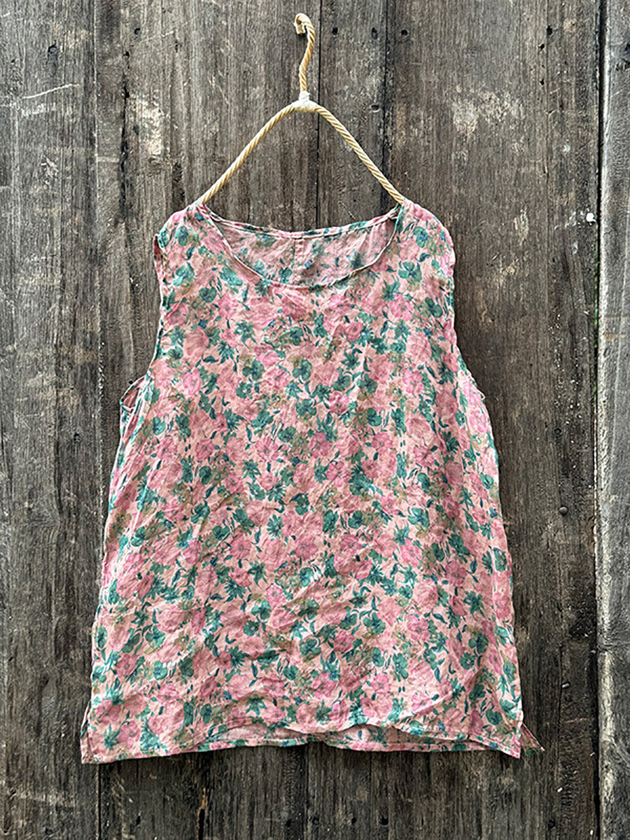 Gilet estivo vintage floreale con scollo a V in ramiè da donna