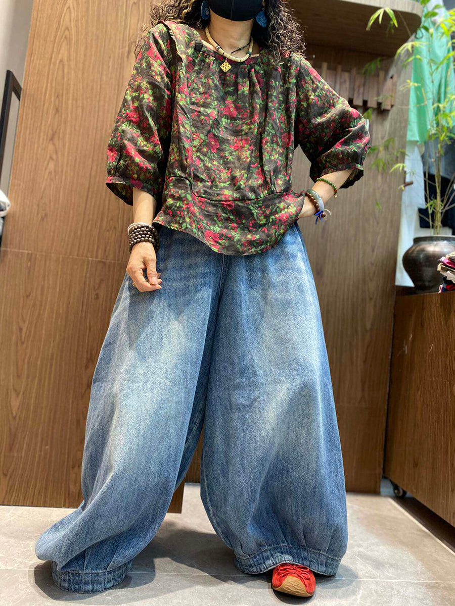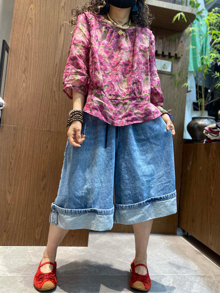 Camicetta da donna estiva vintage con scollo a O e stampa floreale.