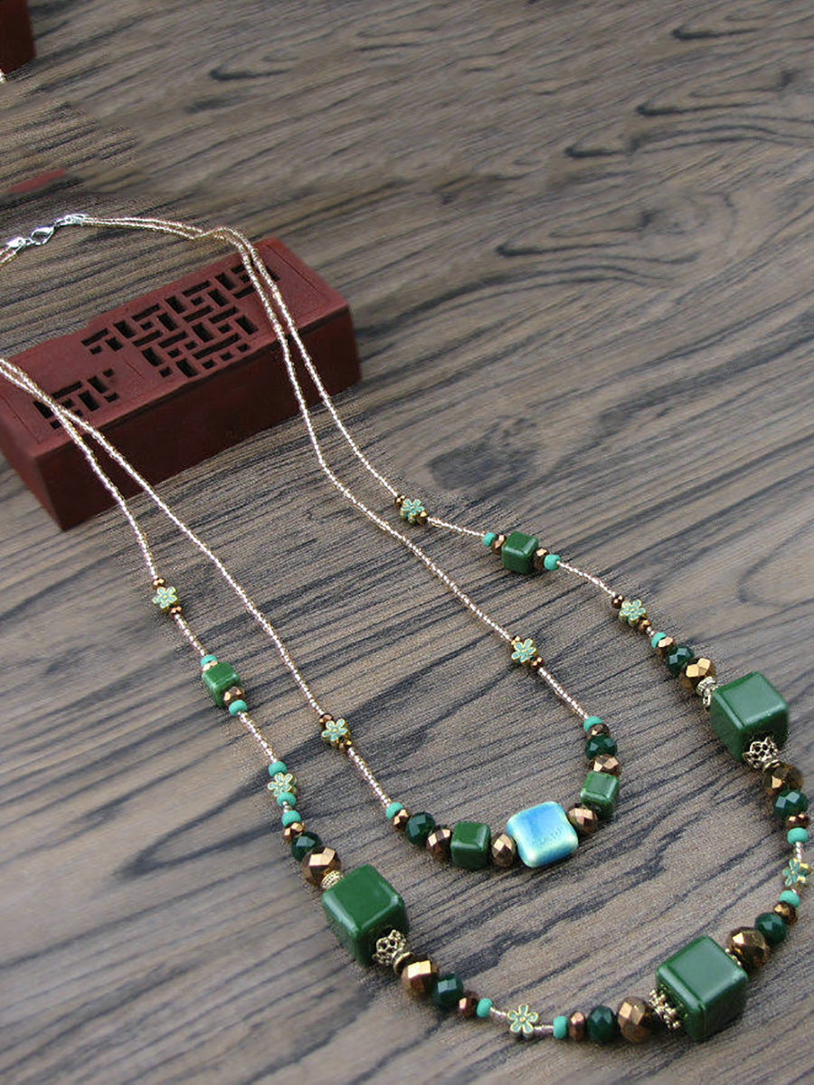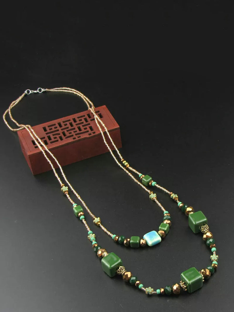 Collana da donna vintage a doppio strato con perline di ceramica verde.