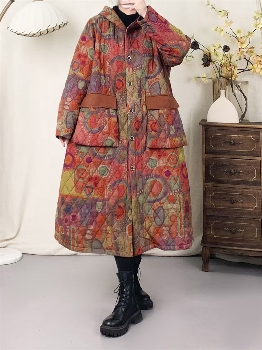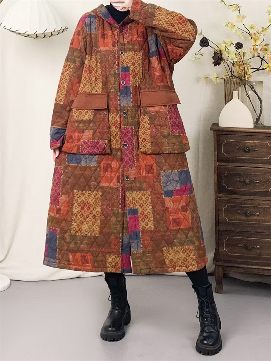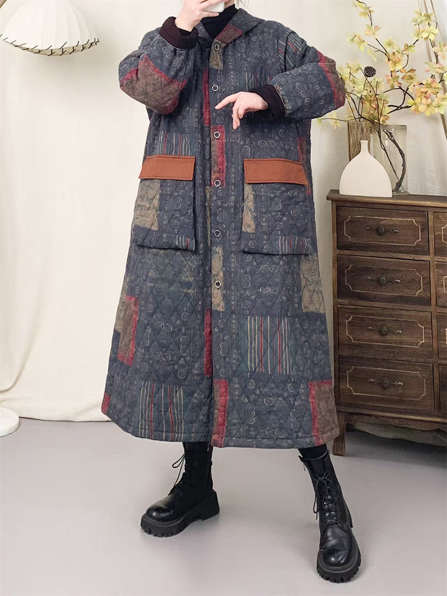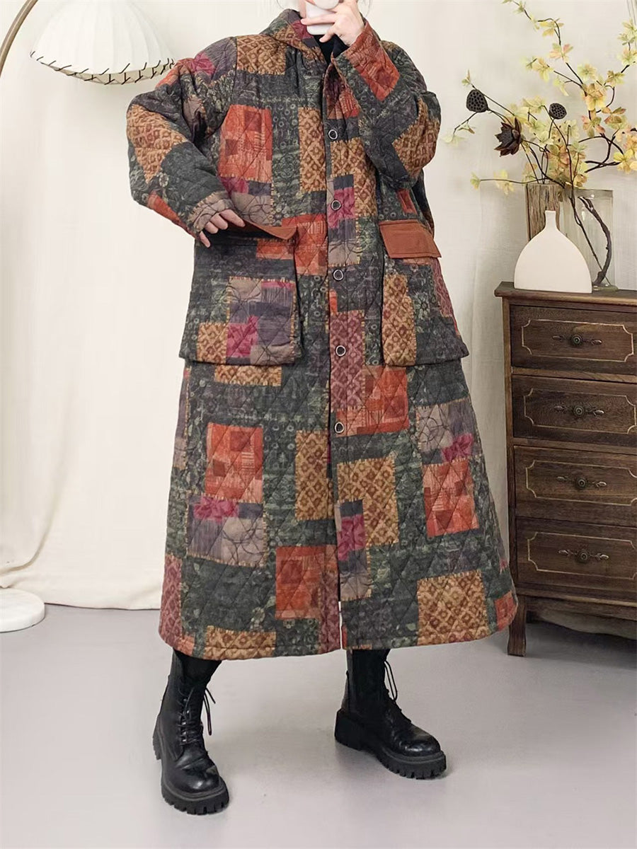 Cappotto invernale da donna in cotone imbottito con cappuccio e patchwork artistico