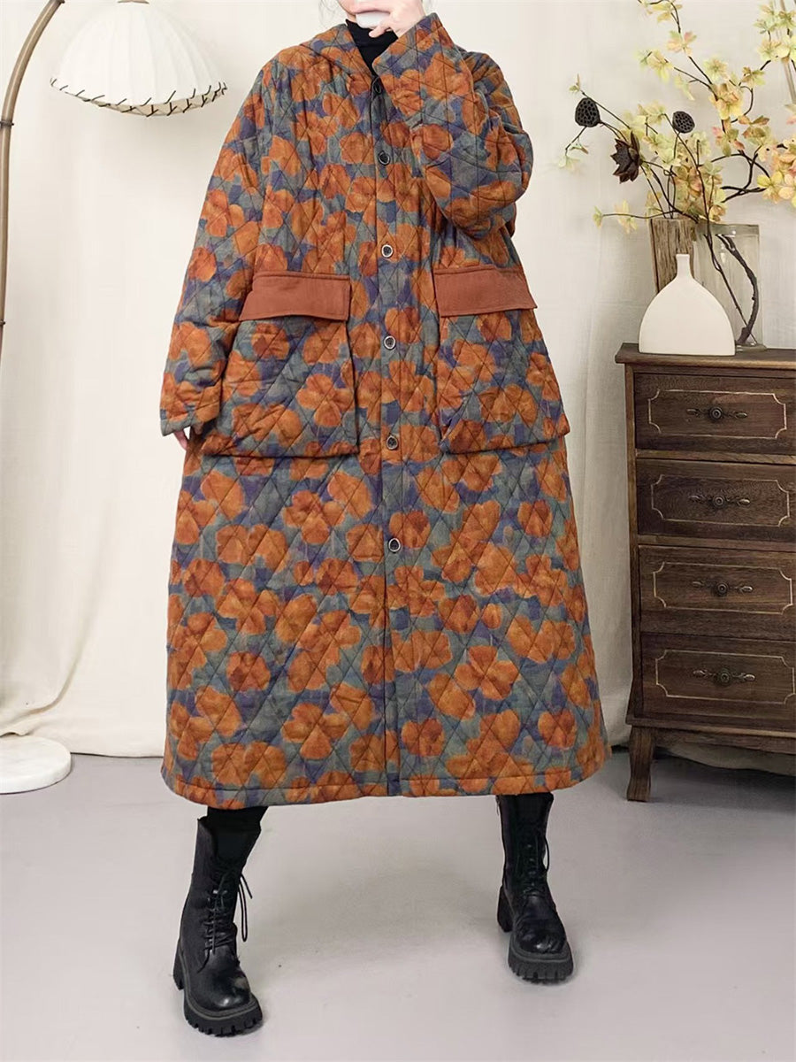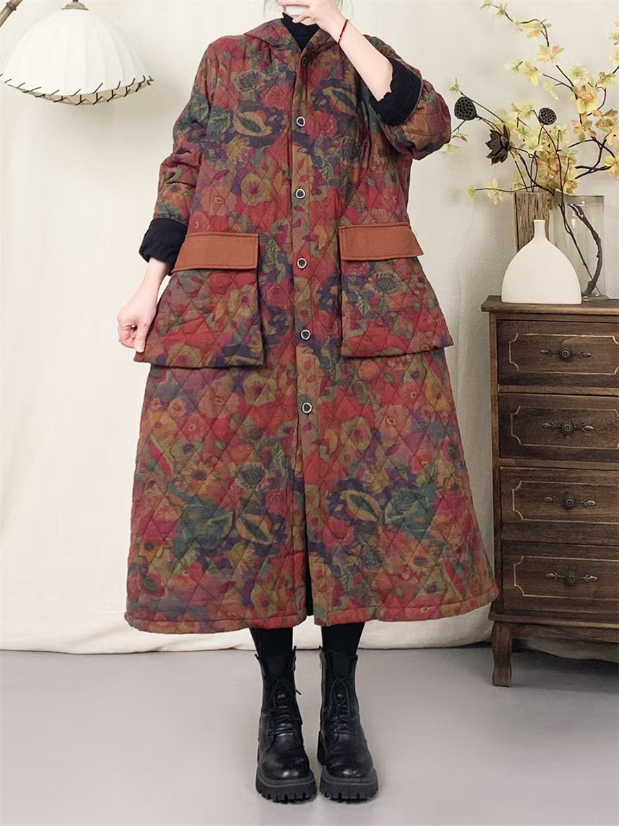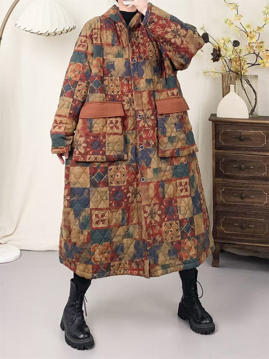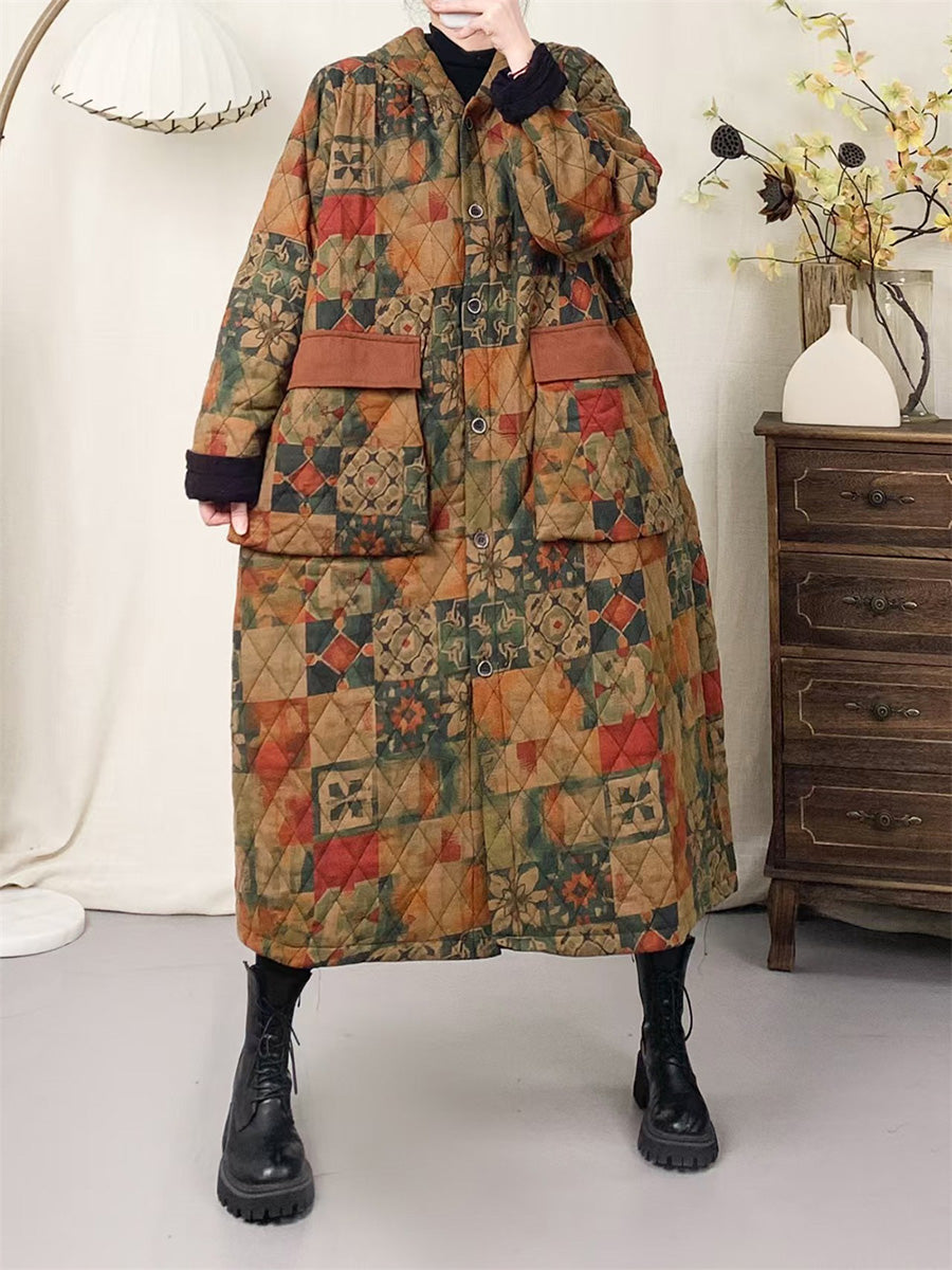Cappotto invernale da donna in cotone imbottito con cappuccio e patchwork artistico