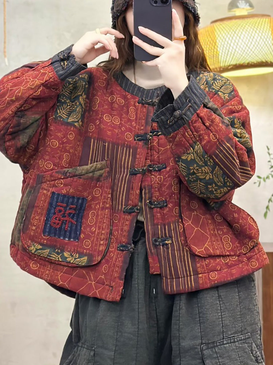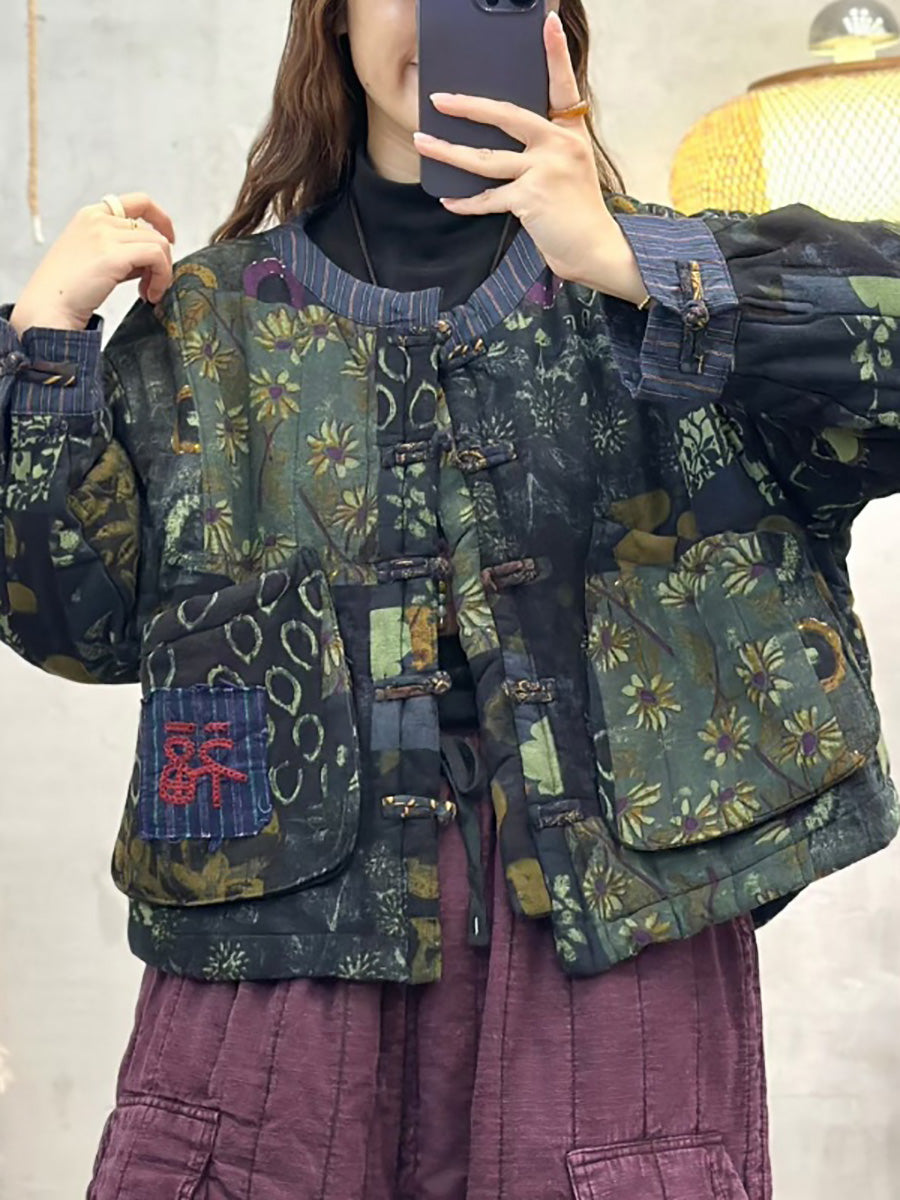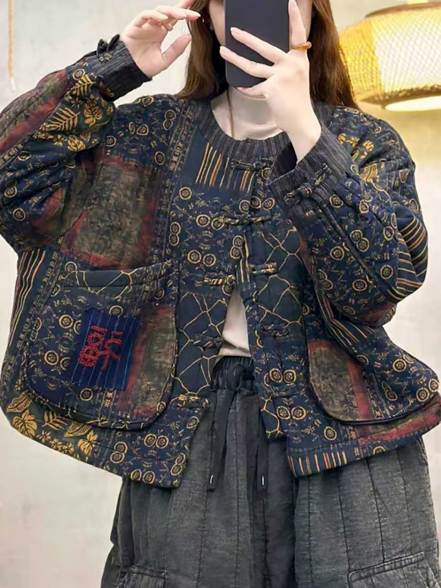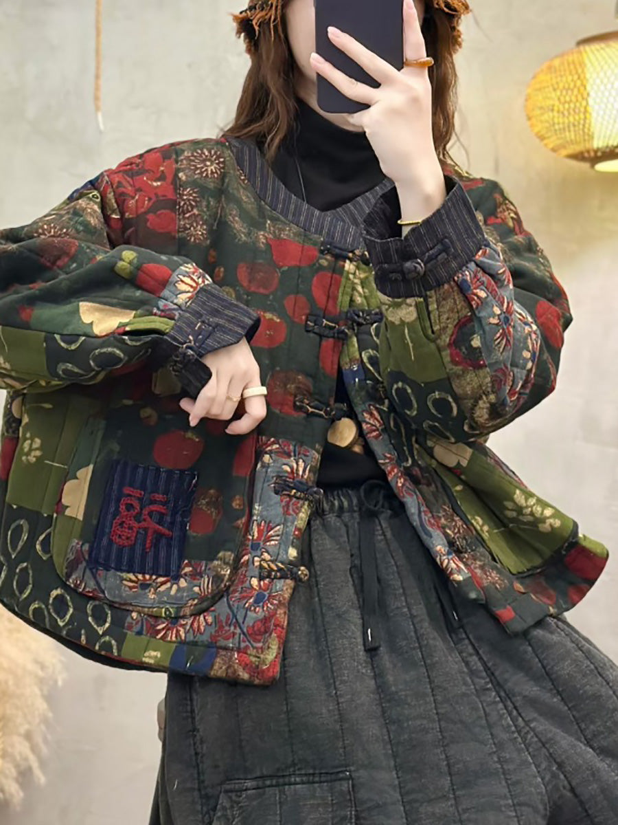Cappotto imbottito con scollo a V e toppe retrò invernali da donna