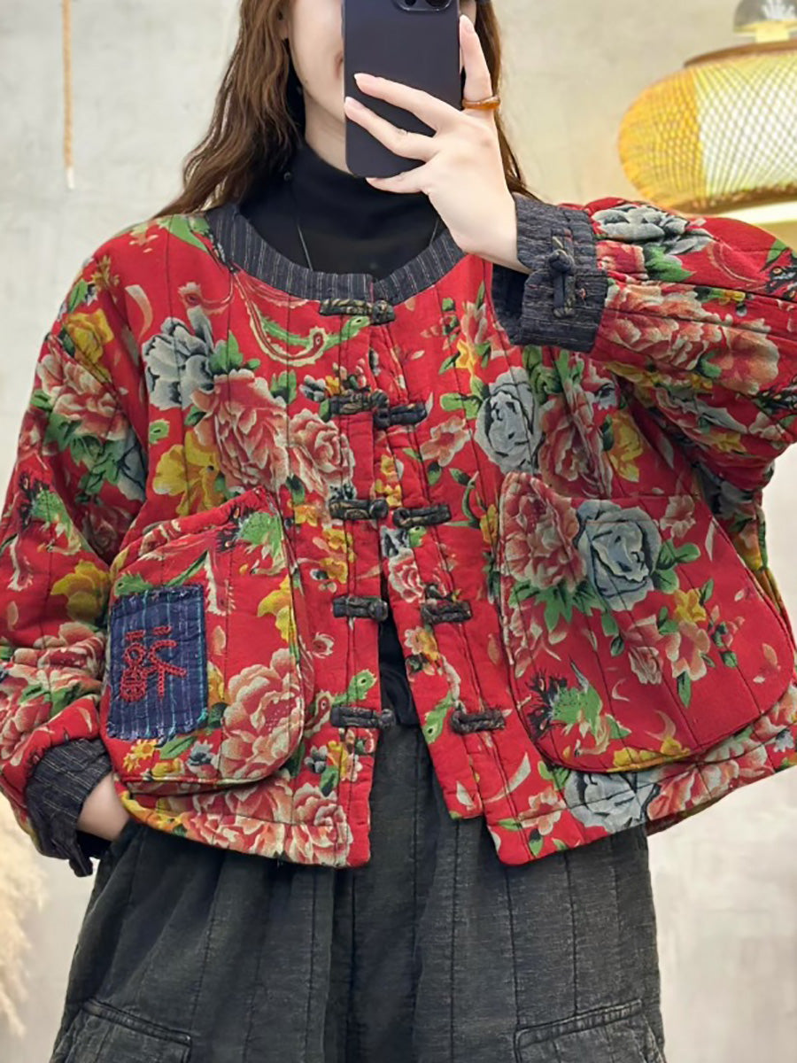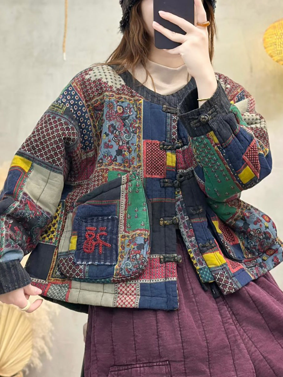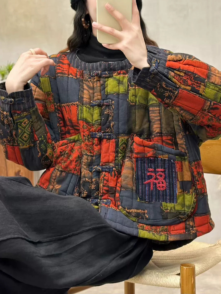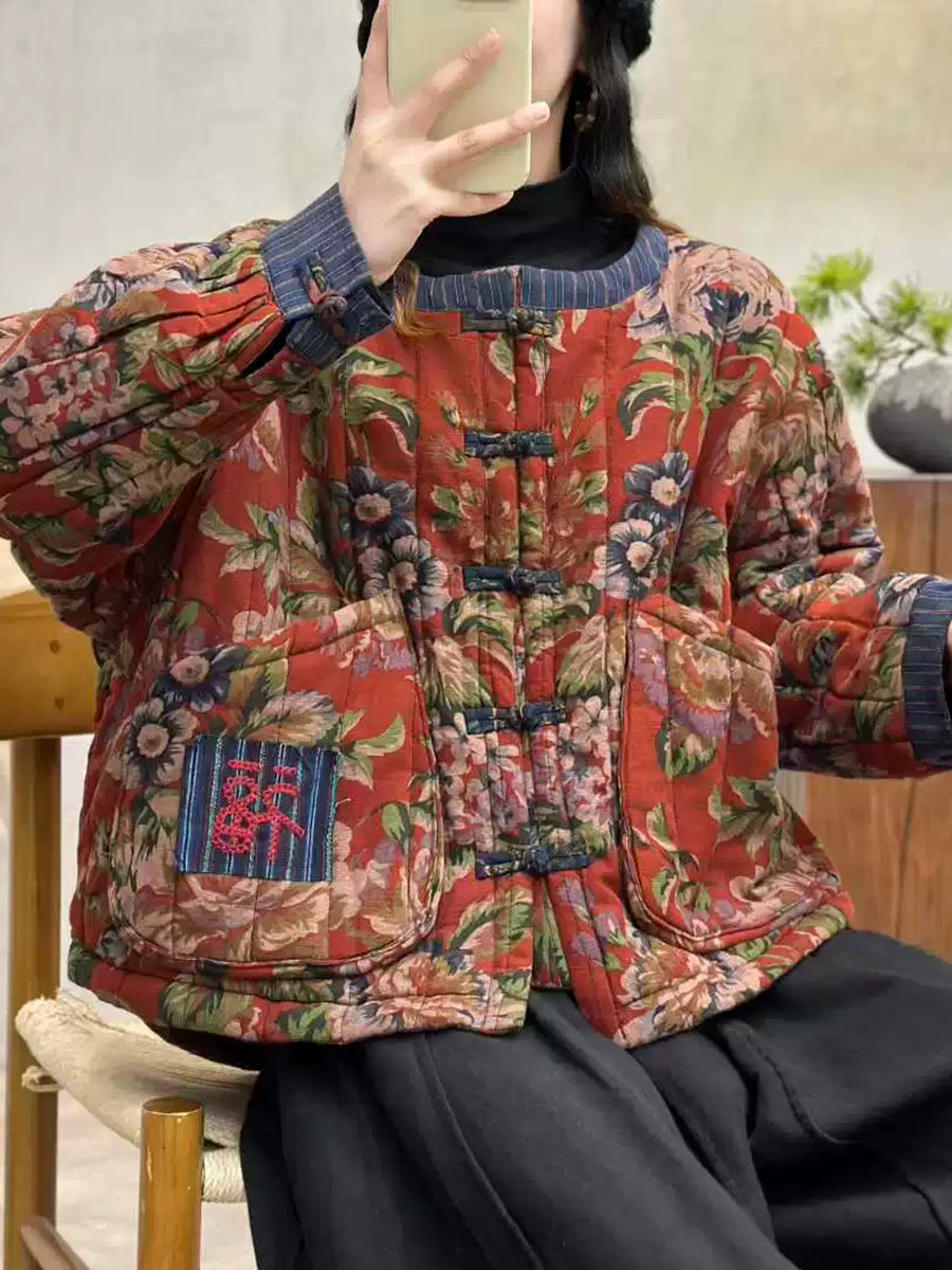 Cappotto imbottito con scollo a V e toppe retrò invernali da donna